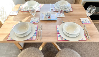 KITCHEN & DINING: The kitchen is fully equipped to include gas cooker, hob, fridge with freezer box and microwave. The dining area benefits from free standing table, corner seating and 2 stools.