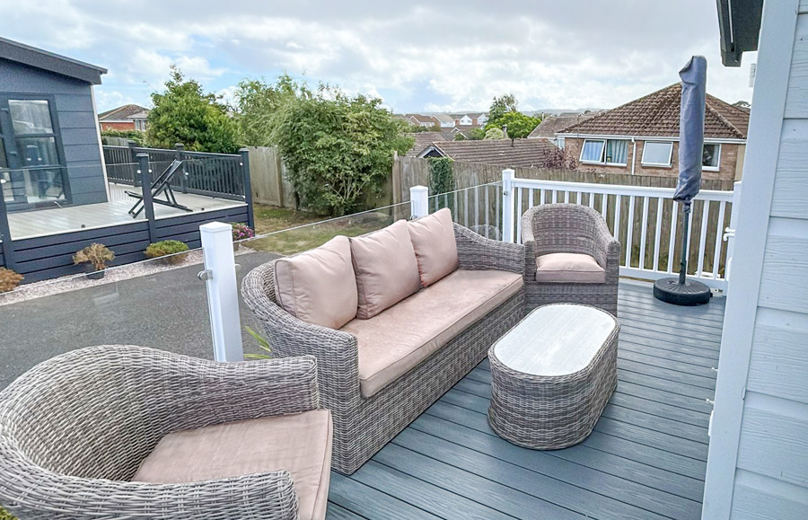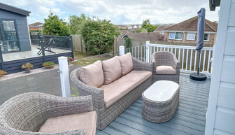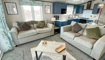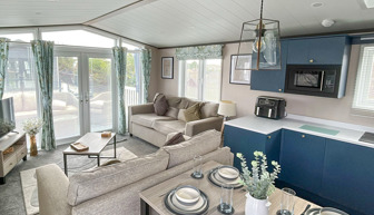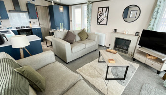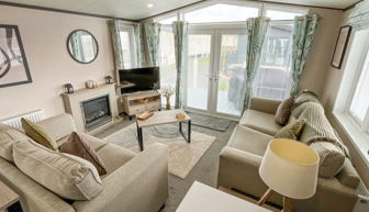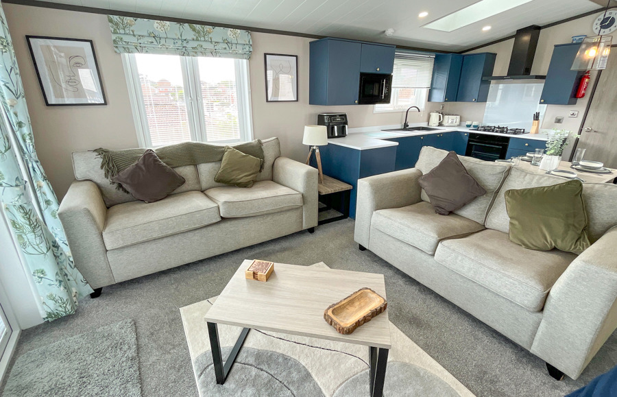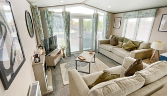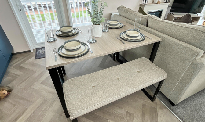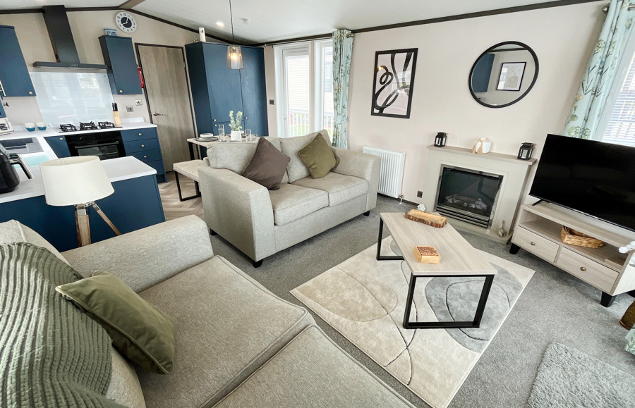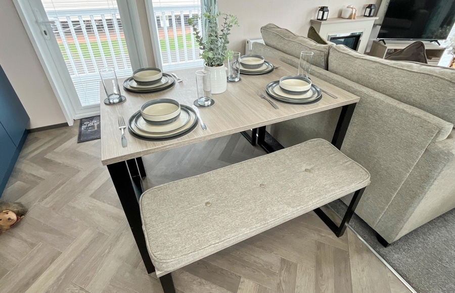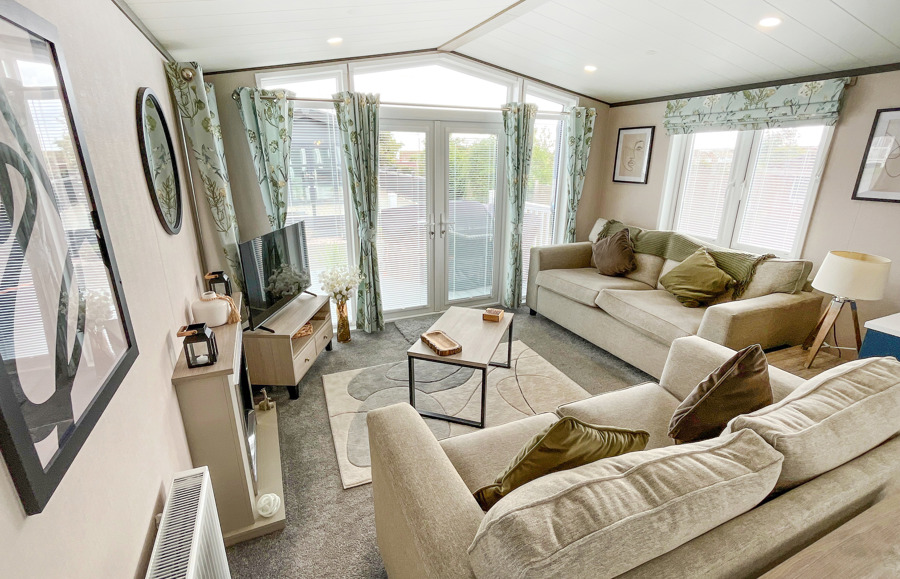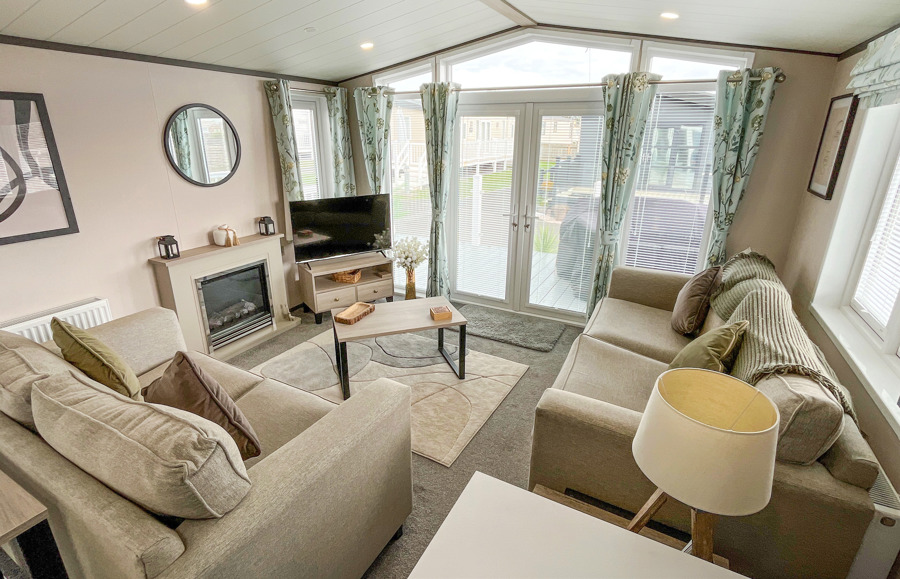 LOUNGE The open plan lounge incorporates 2 & 3-seater sofas, coffee table, French doors from lounge to veranda, electric fire, 40” TV & free view. Occasional sofa bed available for additional guests. Maximum 8 guests.