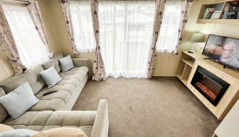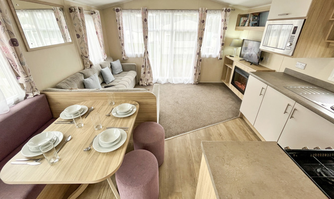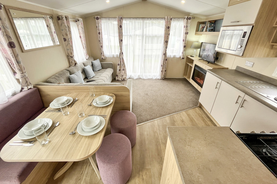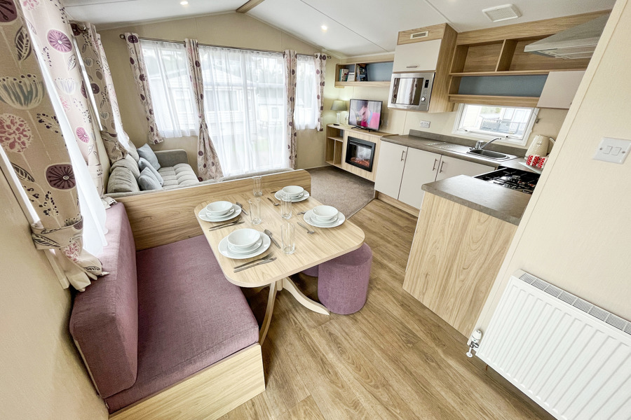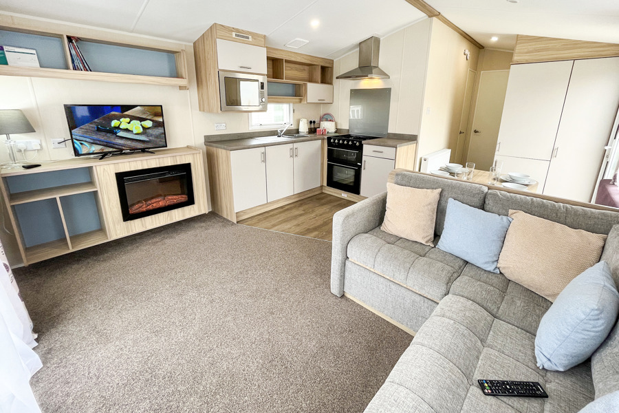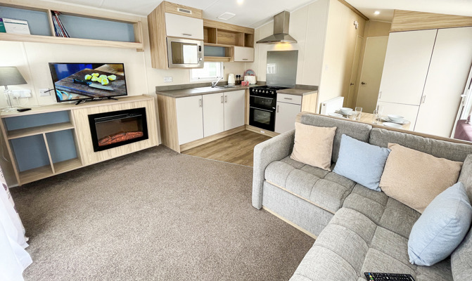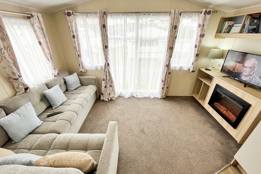 LOUNGE: Open plan with fixed corner seating, TV with Freeview and DVD player and gas fireplace. An occasional pull-out bed is available for those extra guests. BB357 can sleep a maximum of 6 guests.