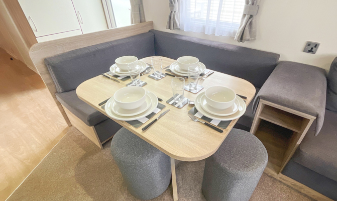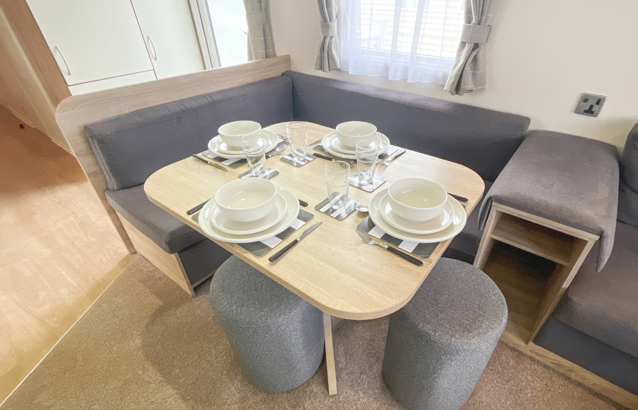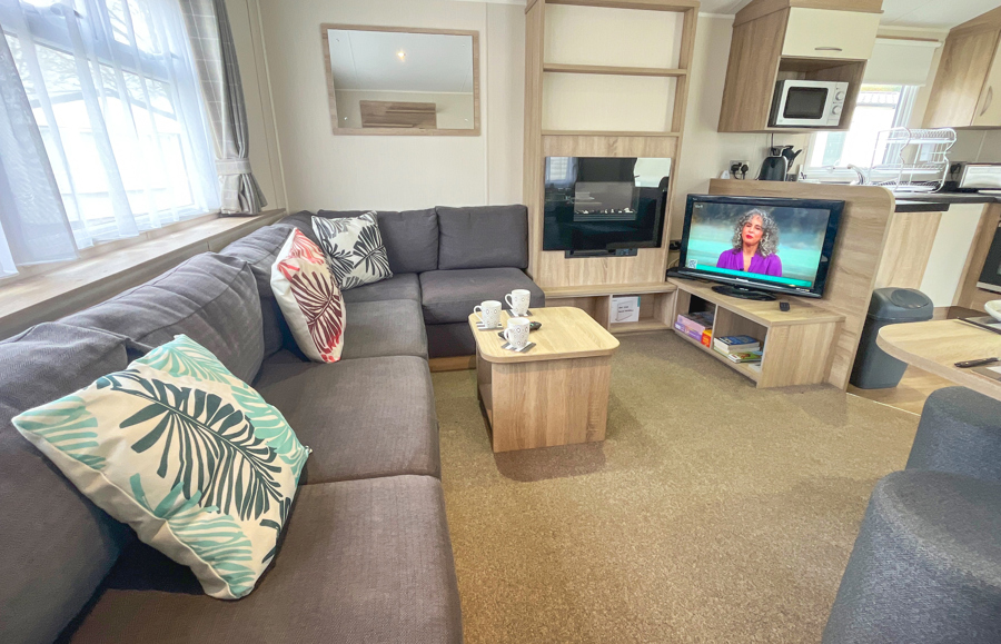 LOUNGE: The open plan lounge incorporates comfortable fixed seating and comes complete with TV, free view, DVD player and gas fire. Please be advised that there is an occasional pull out bed in the lounge for those additional guests.