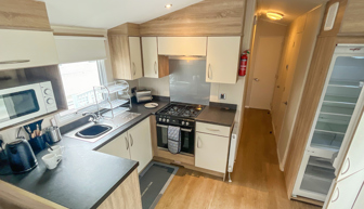 KITCHEN & DINING: The kitchen is fully equipped to include gas cooker, hob, full size fridge-freezer, and microwave. The dining area is comfortable and benefits from both fixed seating and additional stools.