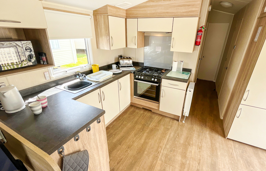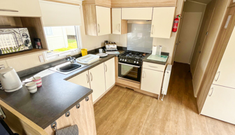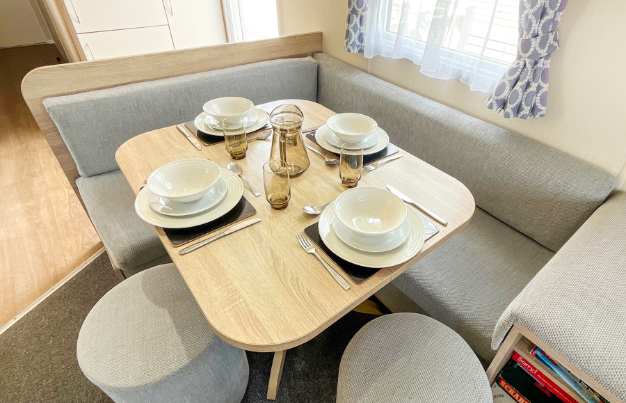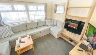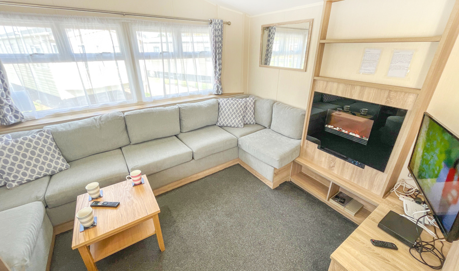 LOUNGE: This holiday home benefits from open plan lounge with fixed sofas (includes an occasional pull out bed for extra guests), large fronted window, flat screen TV, DVD and gas fire.