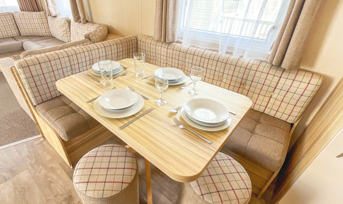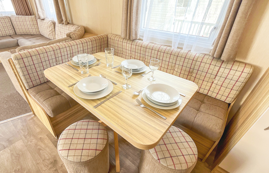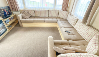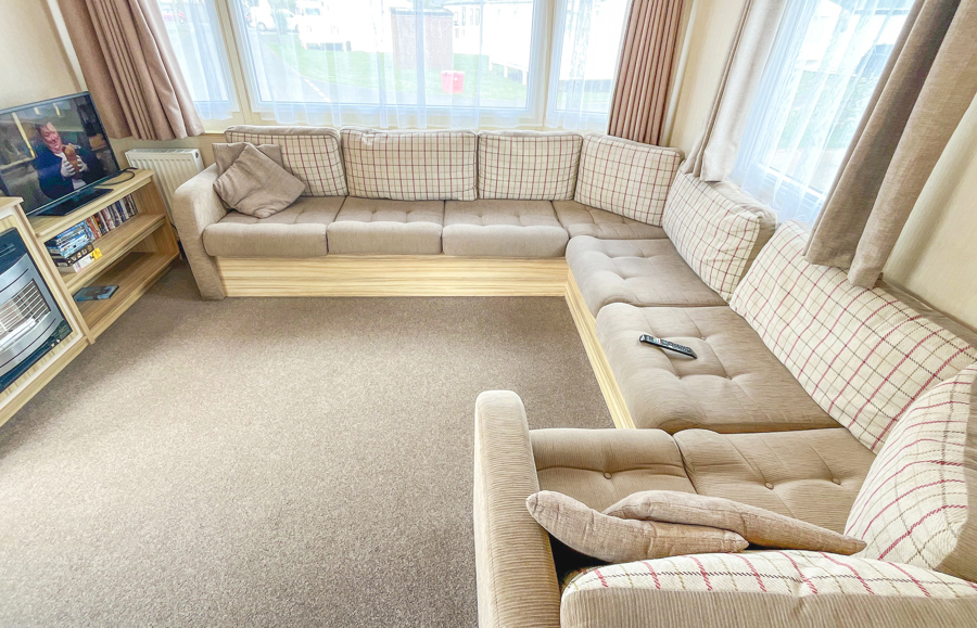 LOUNGE: Open plan with fixed seating, TV with Freeview and fireplace. An occasional sofa bed is available for extra Guests. 28 can sleep a maximum of 8 guests.