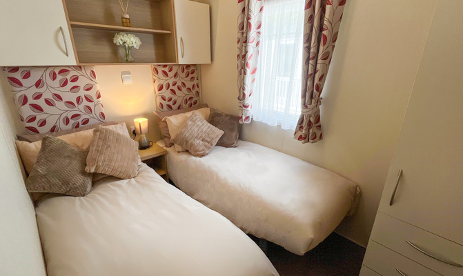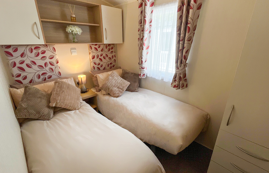 The Twin room has 2 single beds, over bed storage and a single fitted wardrobe.