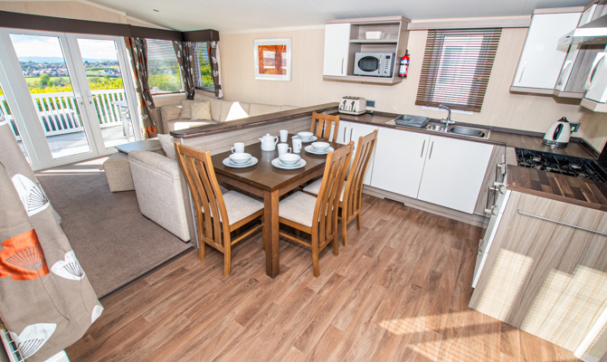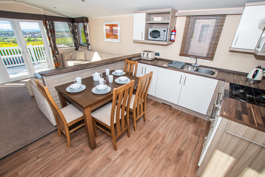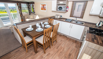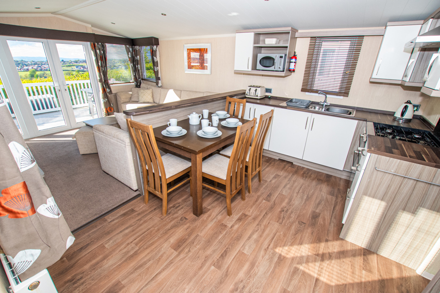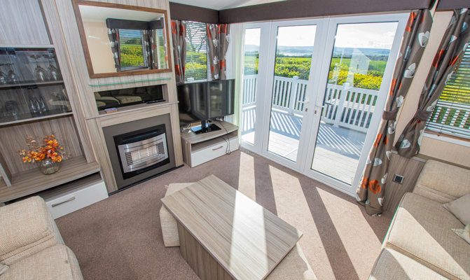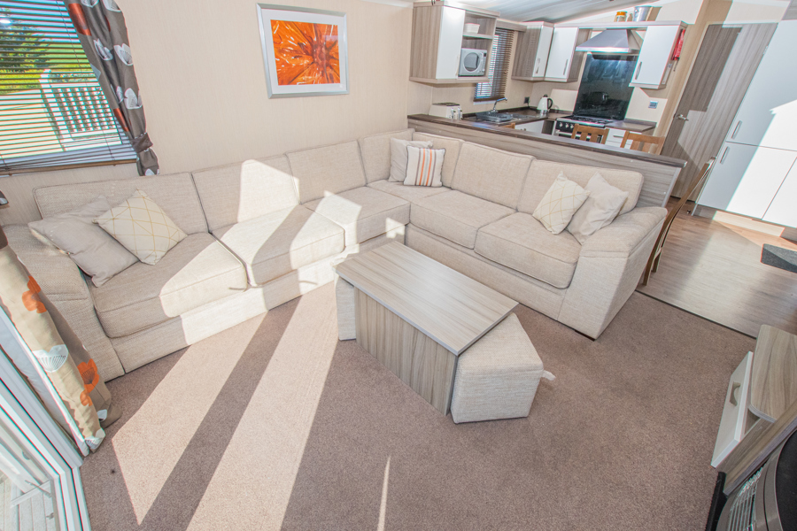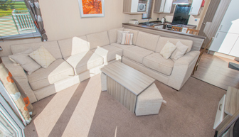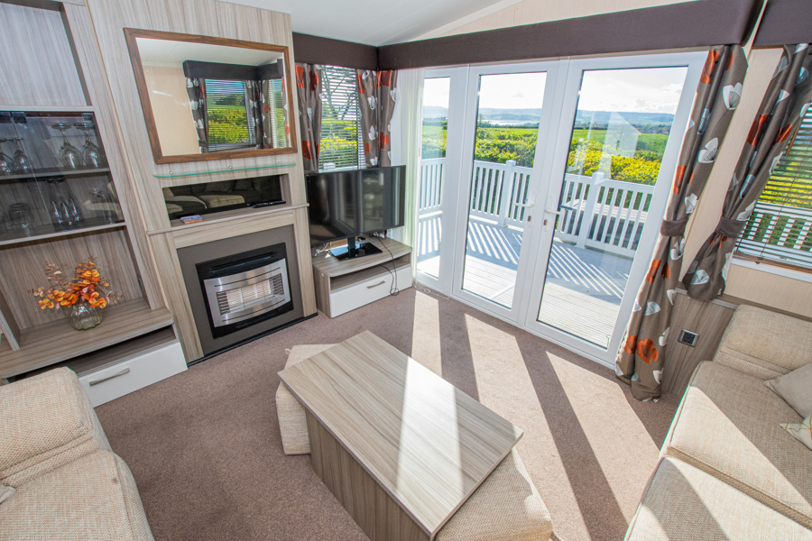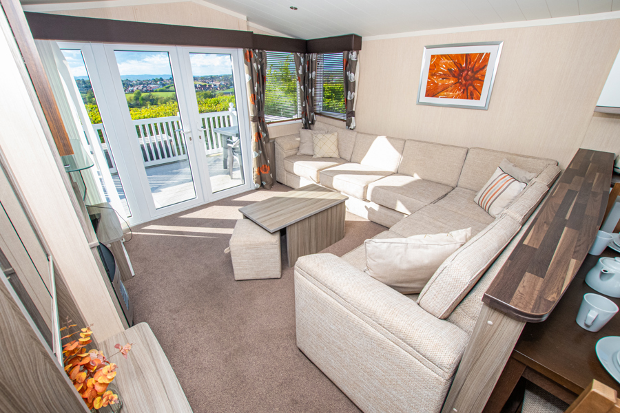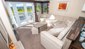 LOUNGE: This holiday home benefits from a comfortable lounge corner sofa, patio doors leading onto the veranda with countryside views, coffee table with two stools, TV, Free-view and an gas fire. The lounge includes a sofa bed. KH13 can sleep a maximum of 8 guests.