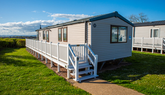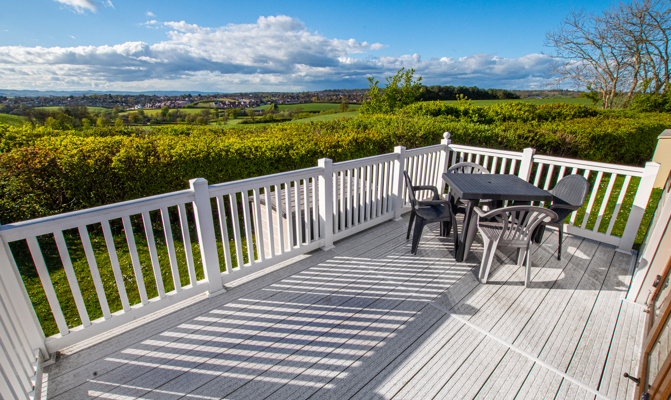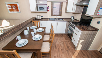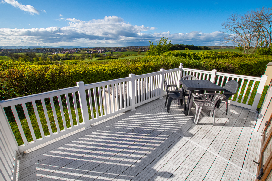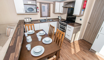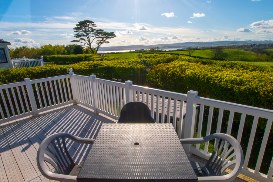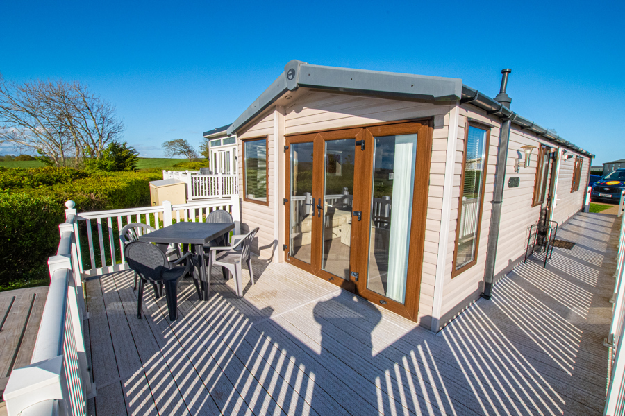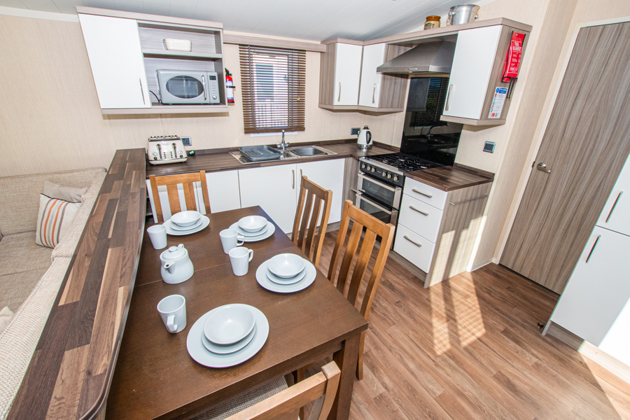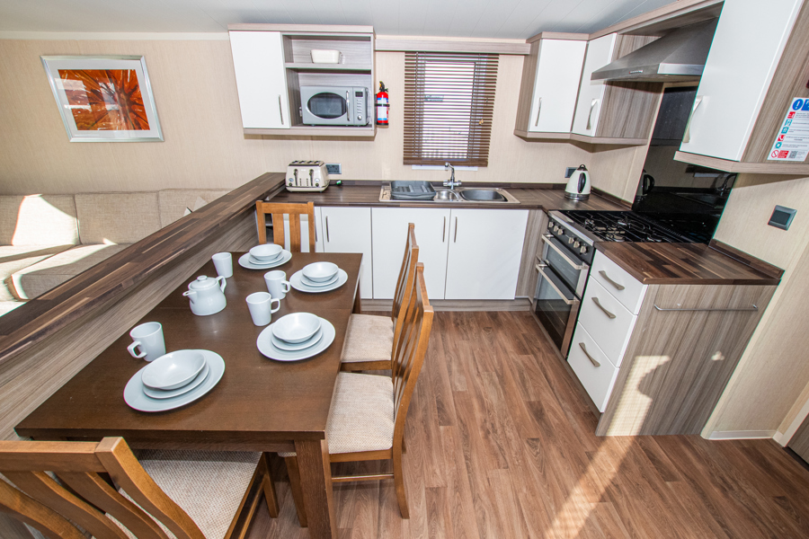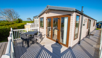 LOUNGE: This holiday home benefits from a comfortable lounge corner sofa, patio doors leading onto the veranda with countryside views, coffee table with two stools, TV, Free-view and an gas fire. The lounge includes a sofa bed. KH13 can sleep a maximum of 8 guests.