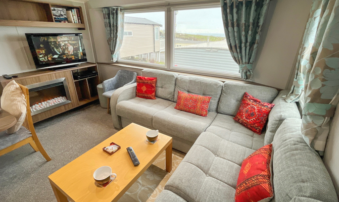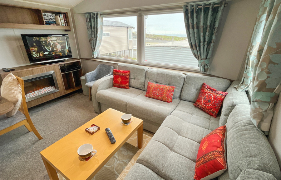 LOUNGE: The lounge benefits from a partial sea view, with an open plan design, fixed corner sofa seating to cater for all the family, built in cabinets with 32" TV, DVD and gas fire.