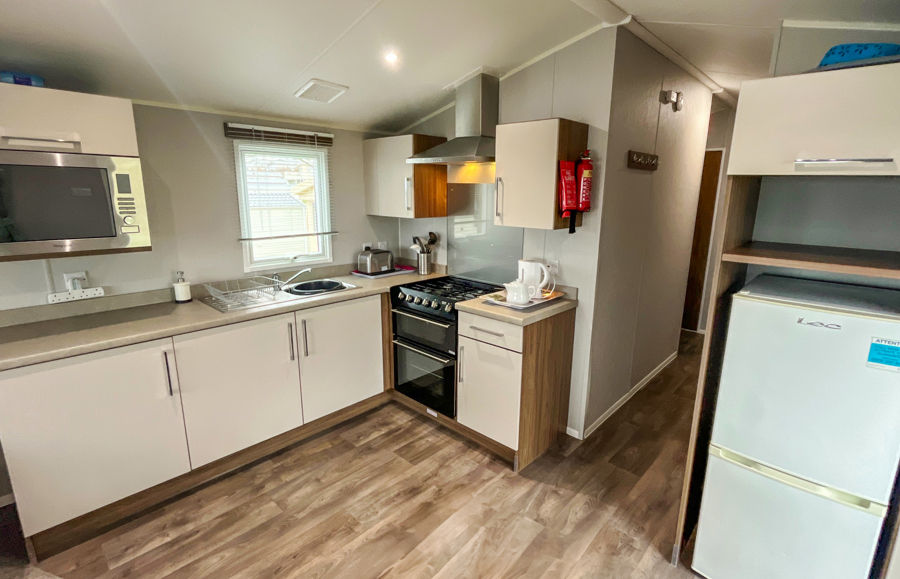 KITCHEN & DINING AREA: The kitchen is fully equipped which includes full size cooker, fridge freezer and microwave. The dining area comprises of fixed corner seating, as well as 2 stools.