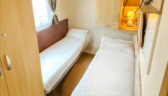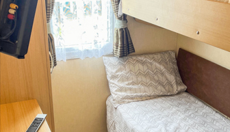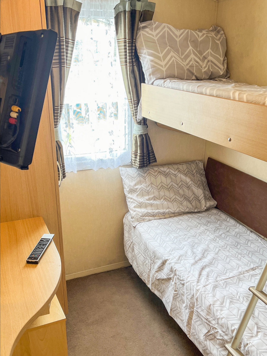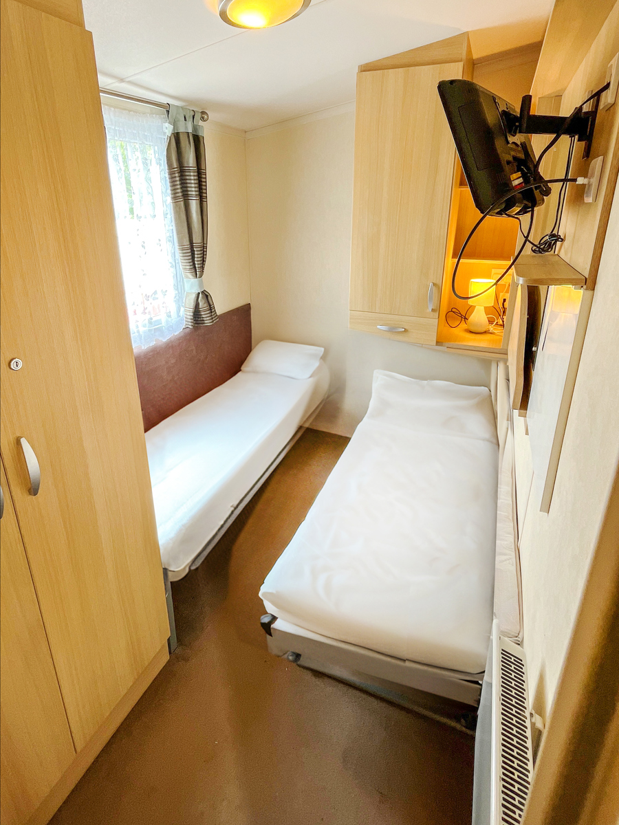 One twin fitted with bunk beds, small wardrobe, small TV with DVD function only and panel heater.