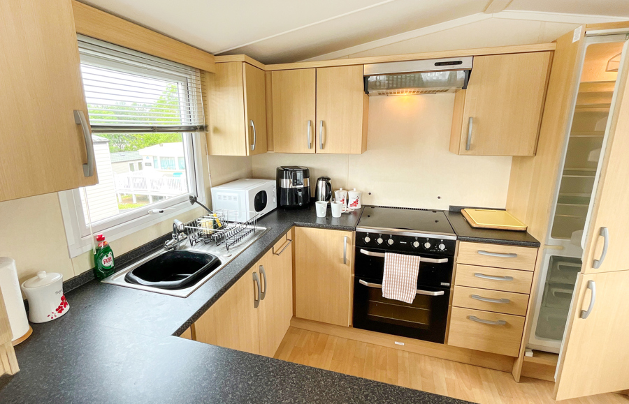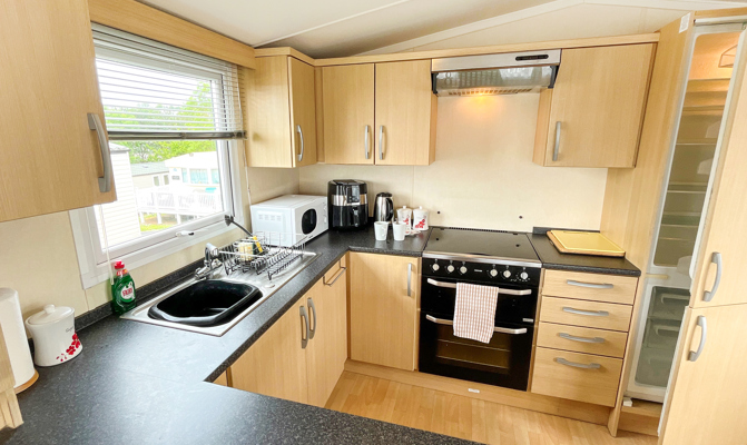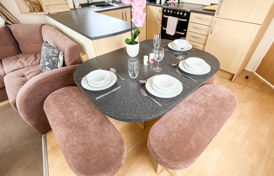 KITCHEN& DINING AREA: Equipped with necessary standard utensils, microwave, fridge freezer, gas oven and grill. The dining area consists of a free-standing table and bench style seats.