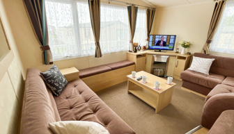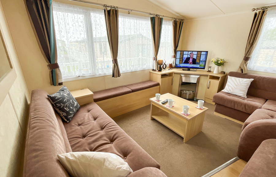 LOUNGE: Open plan with two and three-seater corner sofas, also fitted with occasional pull-out bed for additional guests. Flat screen TV with Freeview and DVD player, coffee table and electric fireplace.