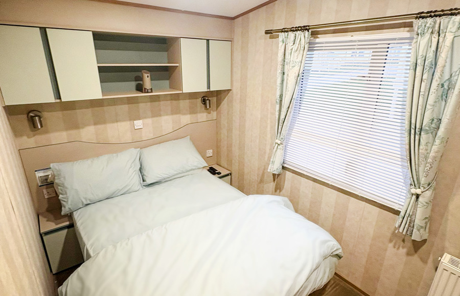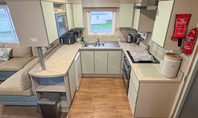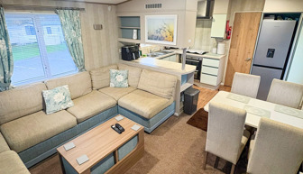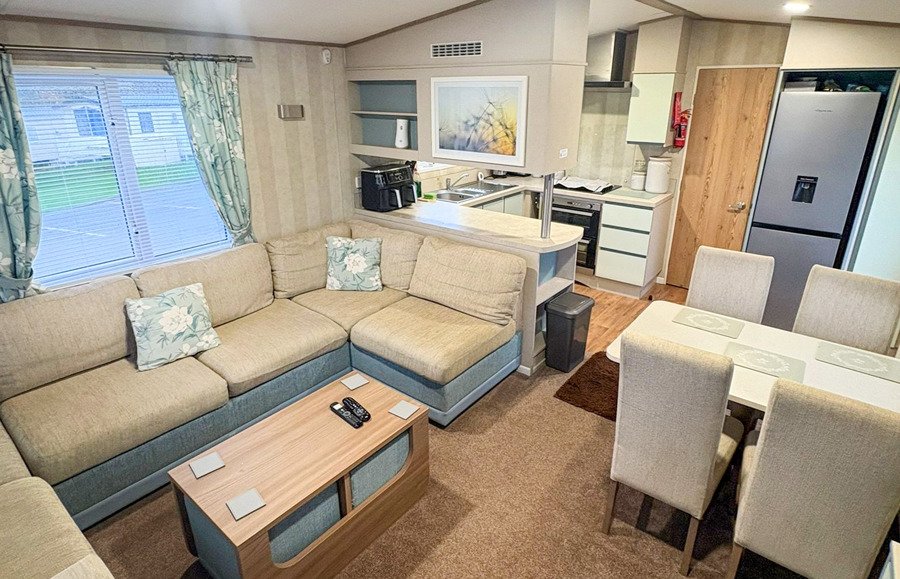 LOUNGE: The lounge has fixed C-shaped seating, coffee table, Smart TV with Free view and sky access. An occasional pull-out bed is fitted for those additional guests. Maximum 8 Guests.