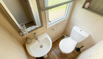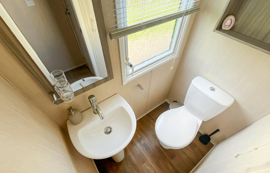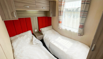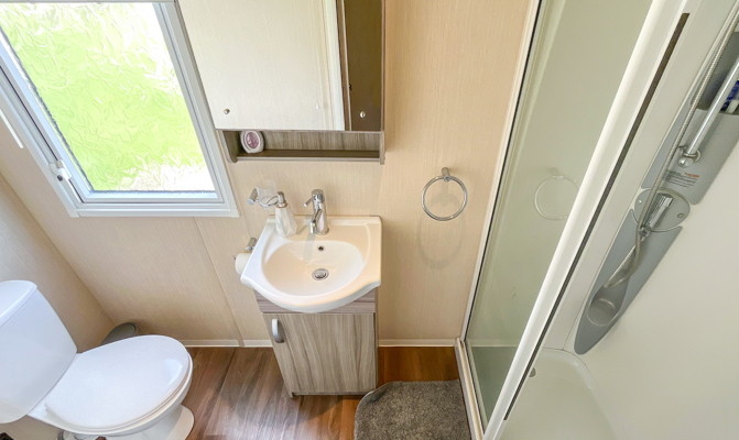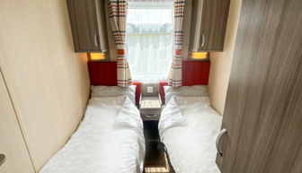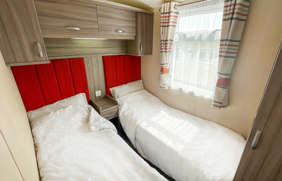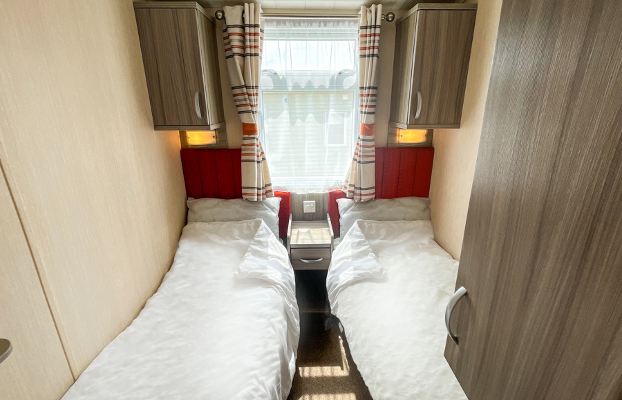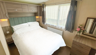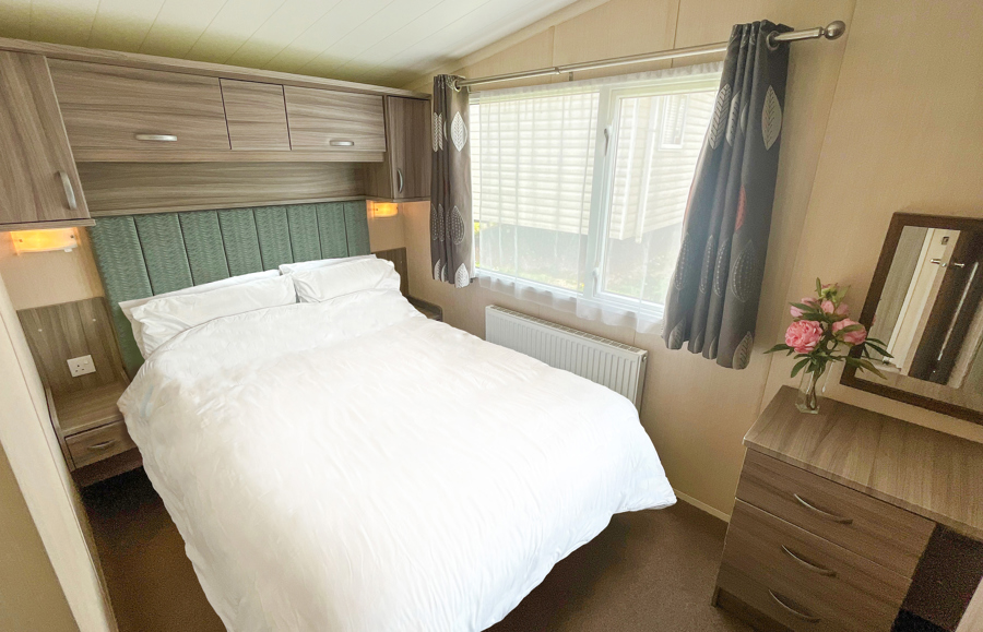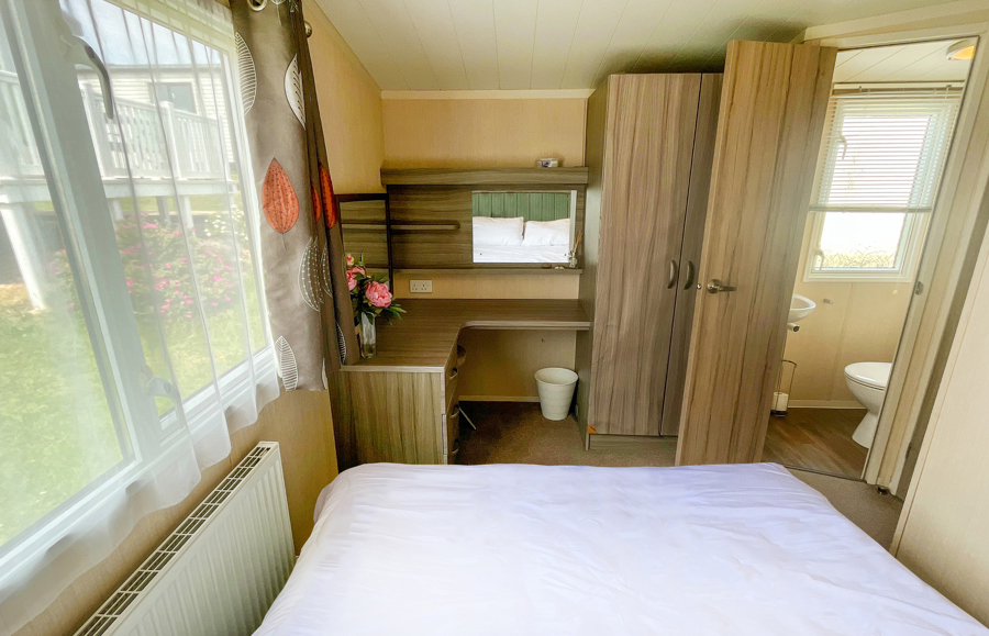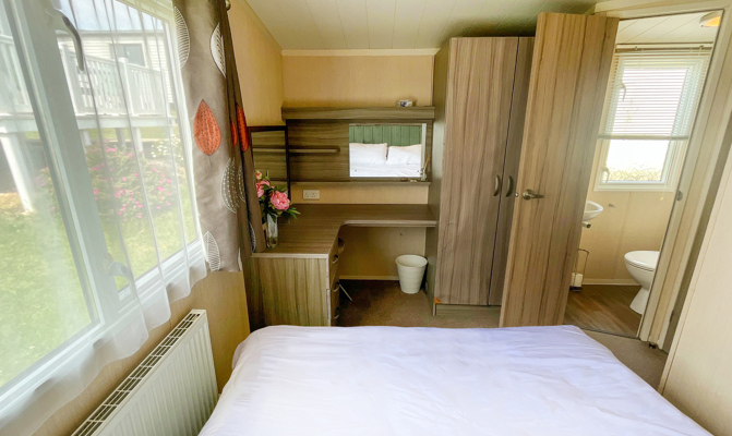 BEDROOMS: Double room at one end of the caravan with fitted wardrobes, vanity area, wall mounted TV and access to own shower room.