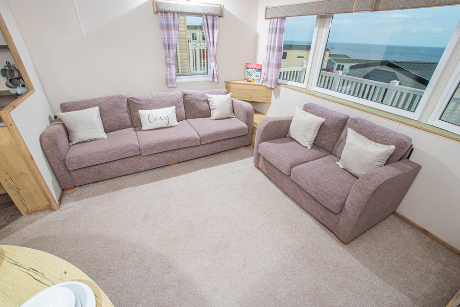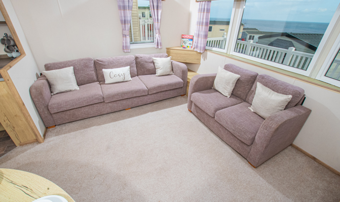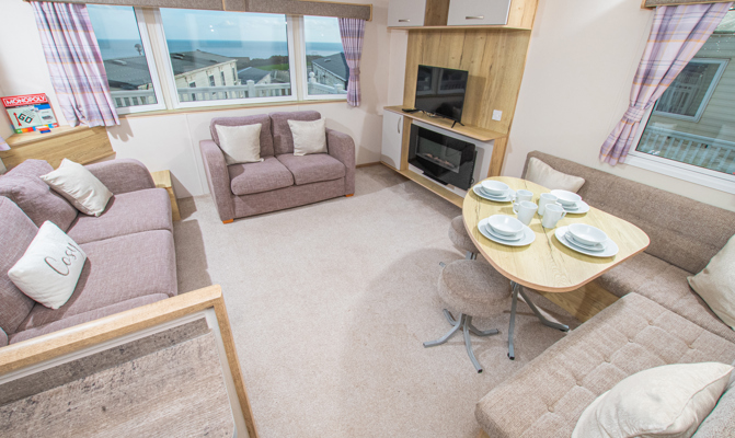 LOUNGE: The lounge has fixed seating allowing plenty of room for guests, fixed cabinets with TV & electric fire. There is an occasional pull-out bed in the lounge to allow for those extra guests.