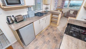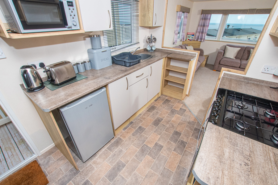 KITCHEN & DINING: The kitchen is fully equipped to include gas cooker, hob, under-counter fridge with freezer box and a microwave. The dining area benefits from both fixed corner seating and 2 x additional stools.