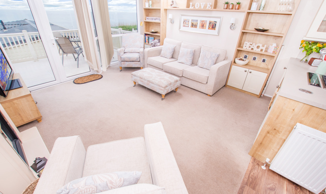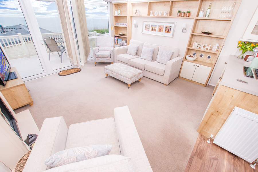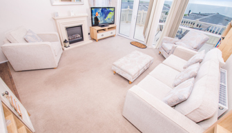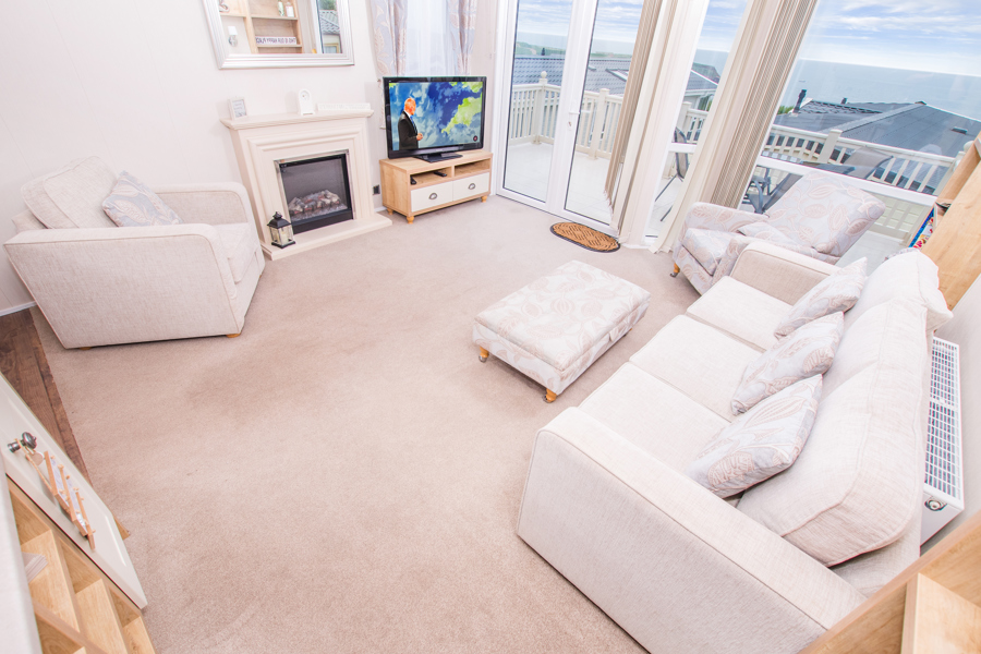 LOUNGE: A spacious lounge, three piece suite, including stylish accent chair and footstool, French doors leading to the large gated veranda to enjoy the sea views, 42" TV with Freeview and DVD player.