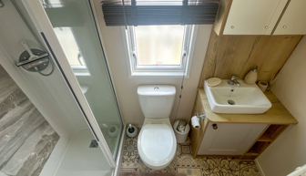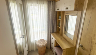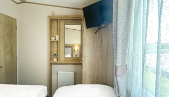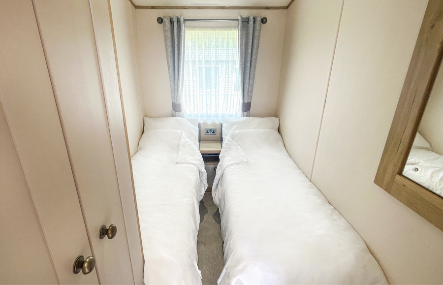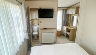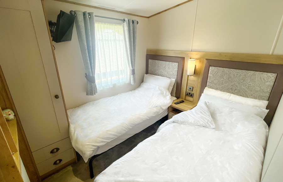 BEDROOMS: The master bedroom includes a double bed, en-suite toilet and hand basin, wall-mounted TV with Freeview, vanity area and fitted wardrobe. Twin room 1 includes 2 single beds, a small wardrobe, vanity area, a bedside cabinet. Twin room 2 has 2 single beds, a small wardrobe and mirror.