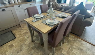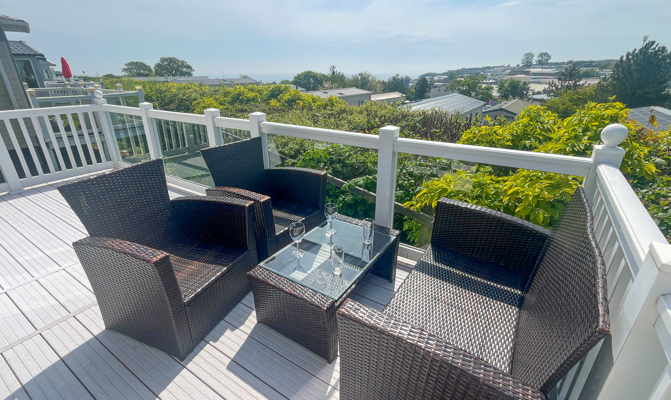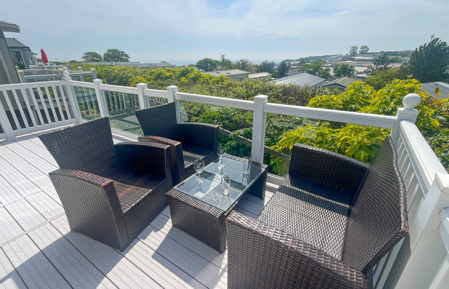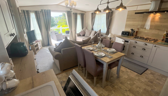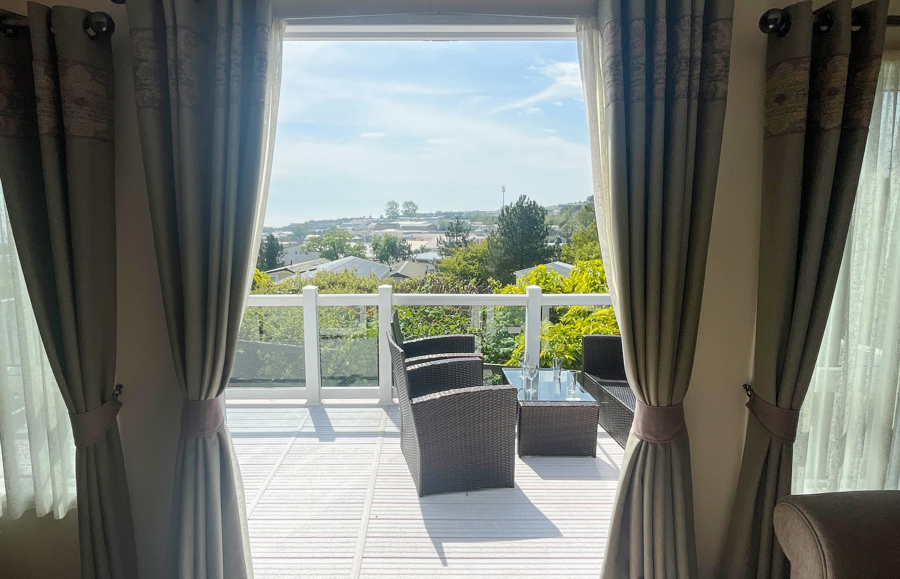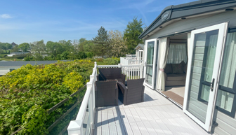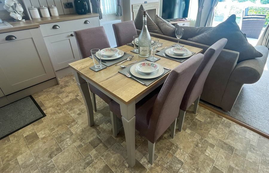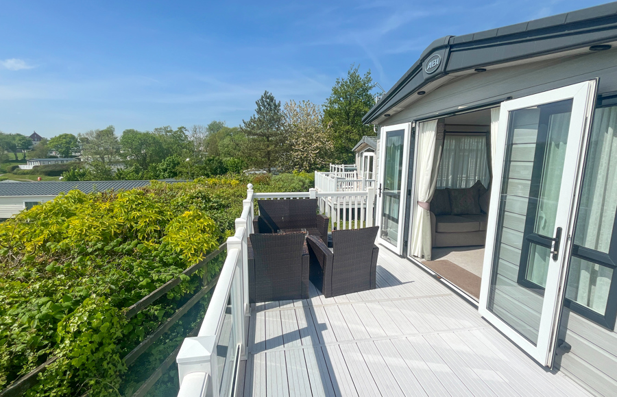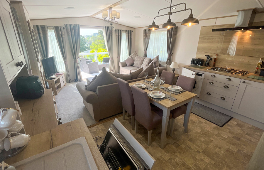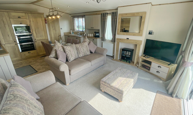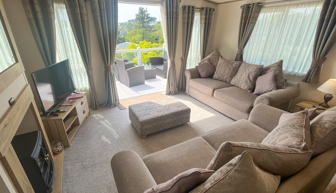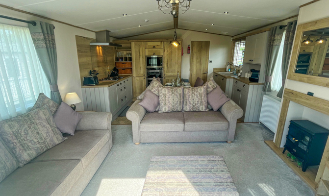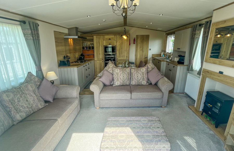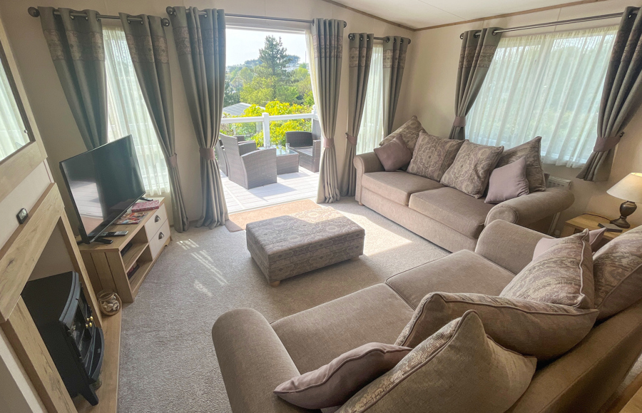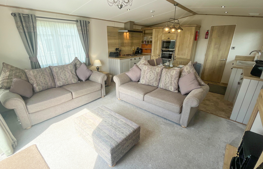 LOUNGE: Open plan with freestanding sofas, ottoman, French doors on to the veranda, TV with Freeview, DVD player and gas fire. Please note MP25 does not include a pull-out bed. Maximum of 6 guests.