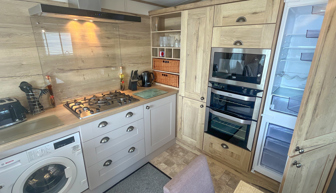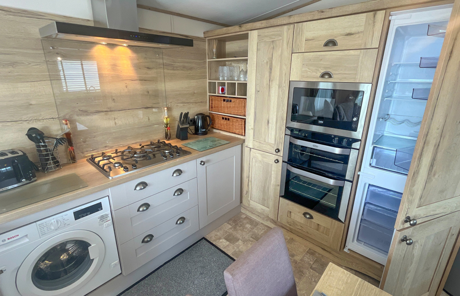 KITCHEN & DINING AREA: Kitchen equipped with necessary standard utensils, integrated microwave, full size fridge-freezer, dishwasher, washing machine, gas oven, grill and hob. The dining area includes freestanding table and 4 chairs.