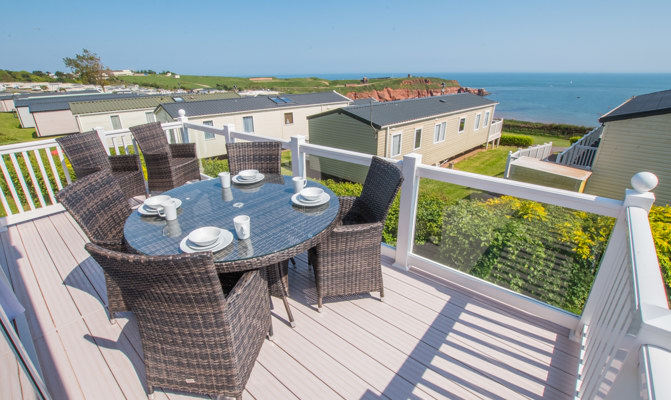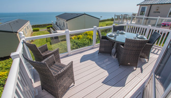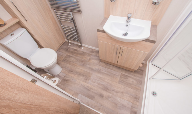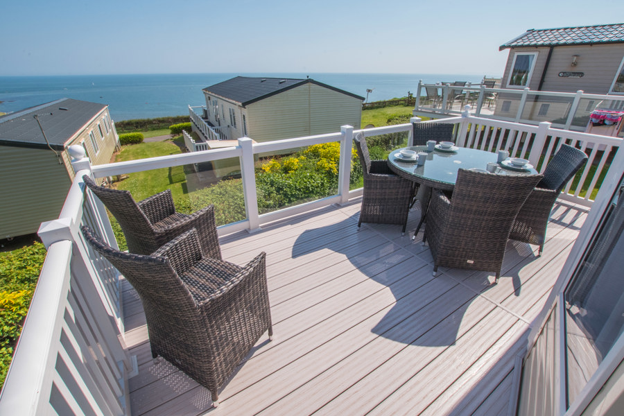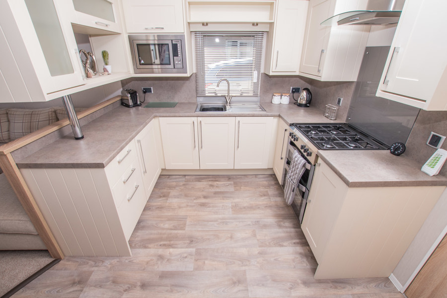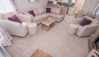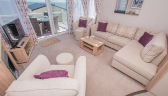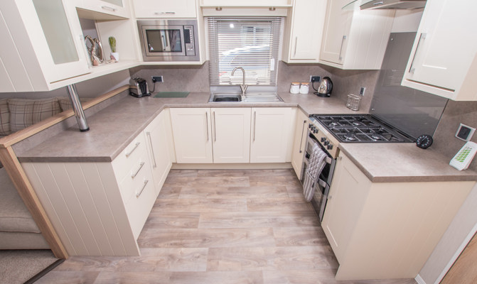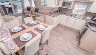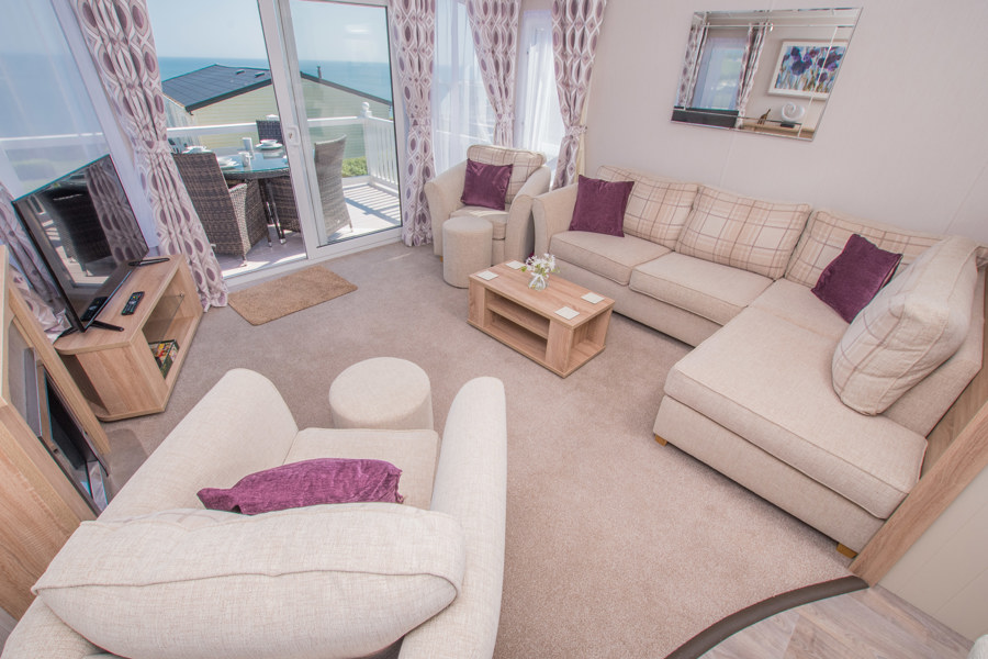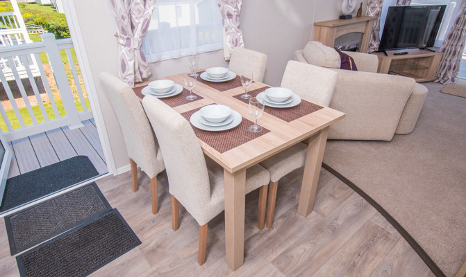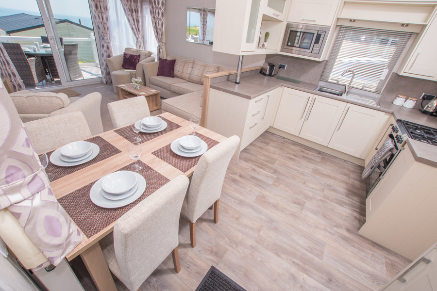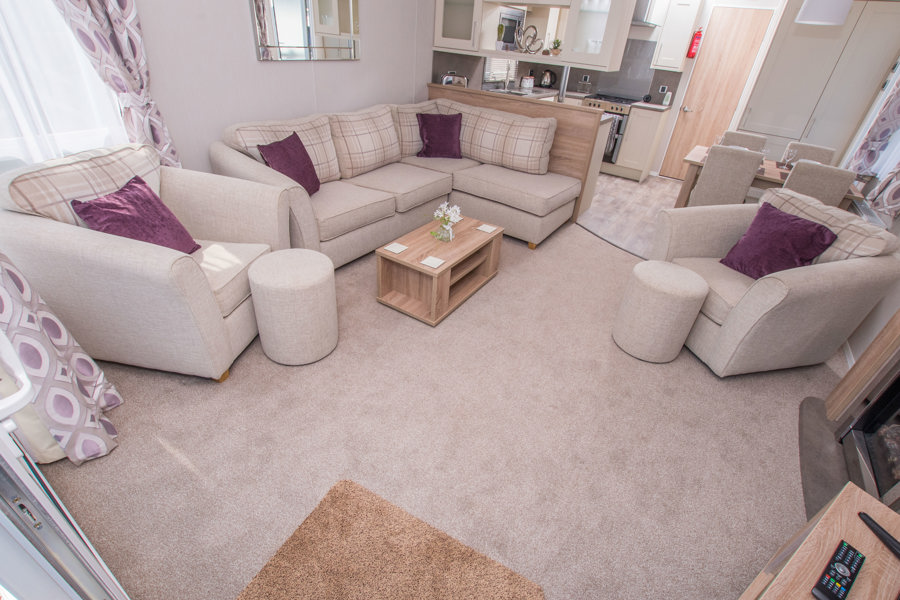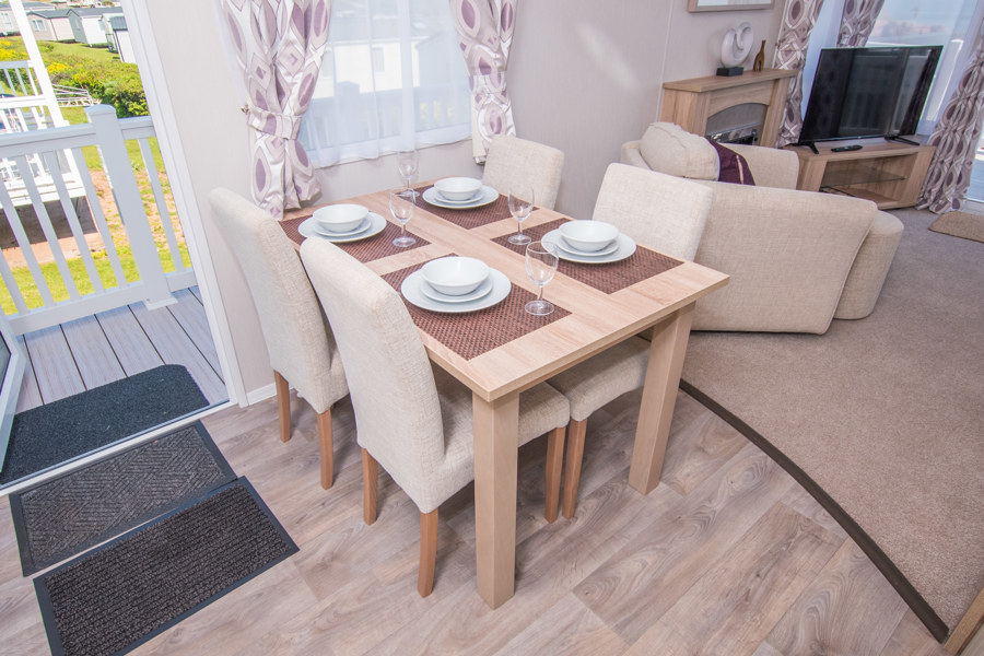 LOUNGE: W15 benefits from sliding patio doors opening onto the veranda with sea views. This holiday home benefits from a comfortable lounge furnished with L-Shaped fixed seating and 2 arm chairs, 42" TV, DVD, Free View and a modern flame effect fire. There is an occasional sofa bed available in the lounge. W15 can accommodate a maximum of 8 guests.