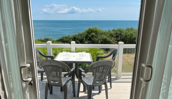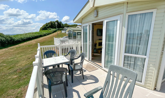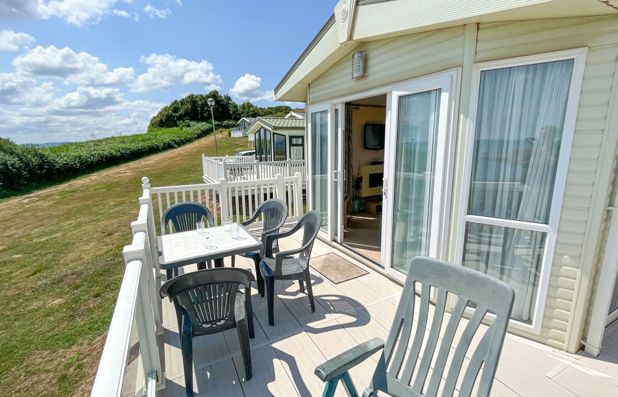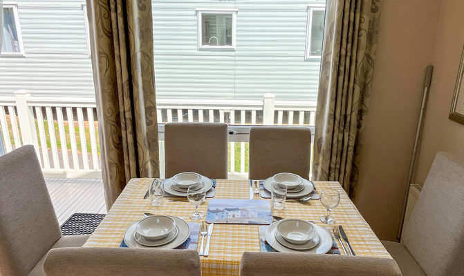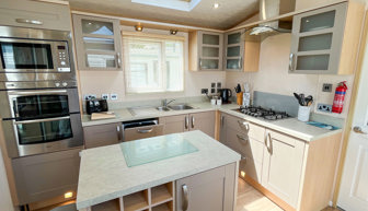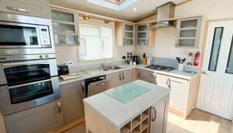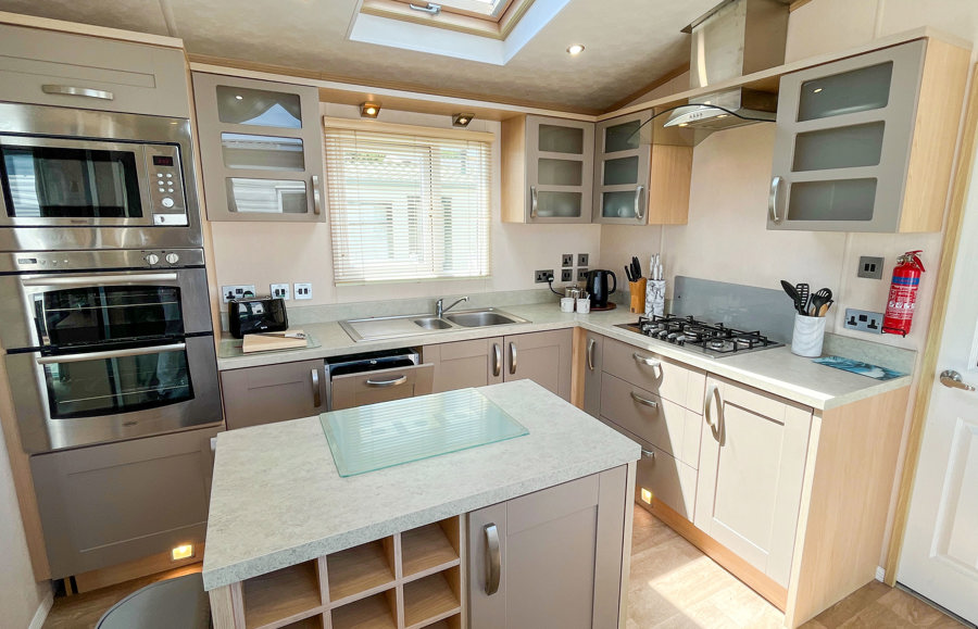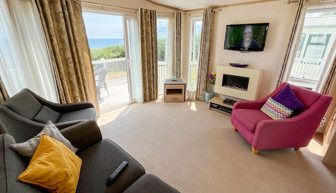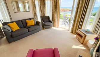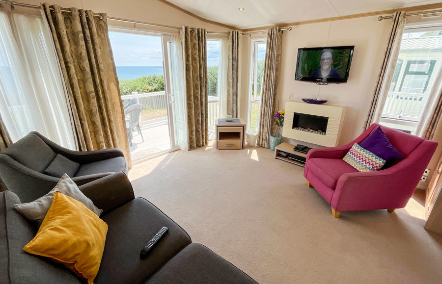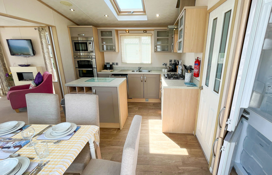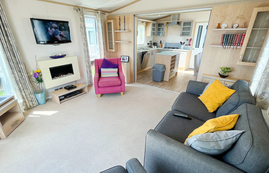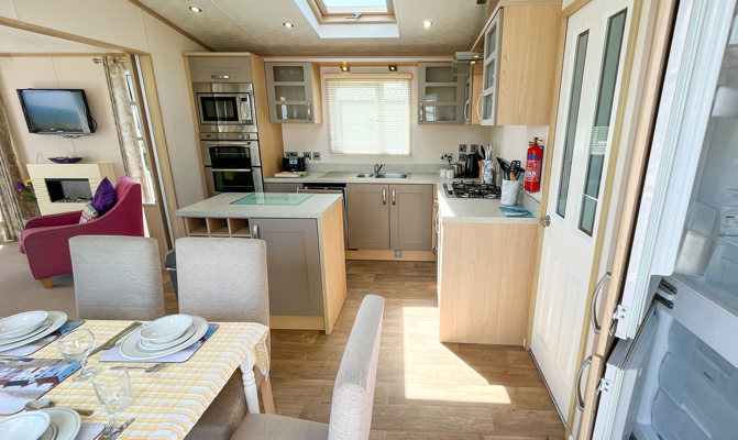 LOUNGE: This holiday home has many things to offer, a spacious lounge with increased height as well as width. The large sliding doors offer the guests a choice of open plan living or privacy from the kitchen. Offering extremely comfortable free standing furniture, four panel patio doors opening onto the ramped & gated veranda and beautiful front row sea views, wall mounted 32” colour TV, DVD, Free view, fixed units and contemporary fire with remote control. Please be advised that no occasional pull out bed is fitted.