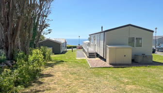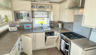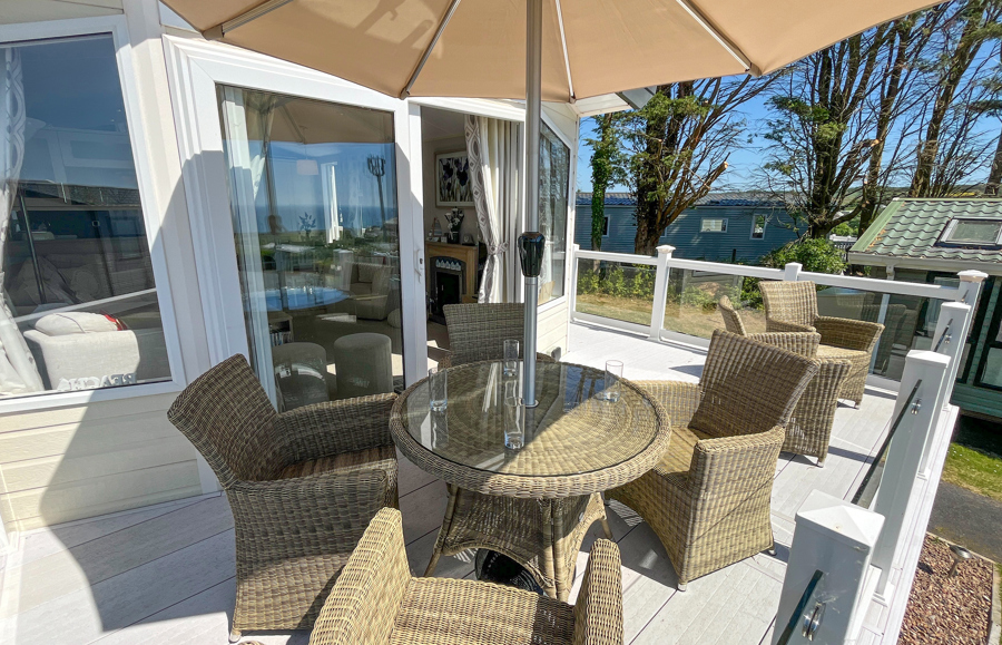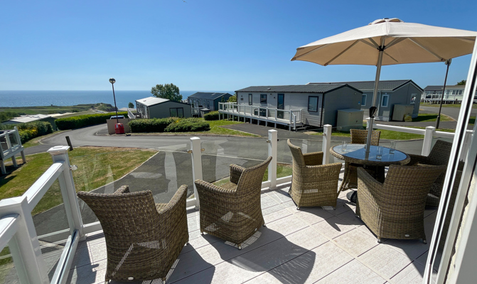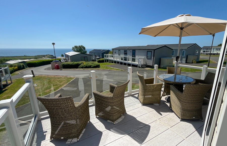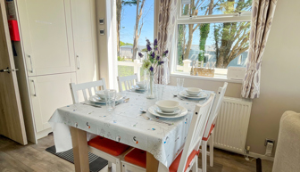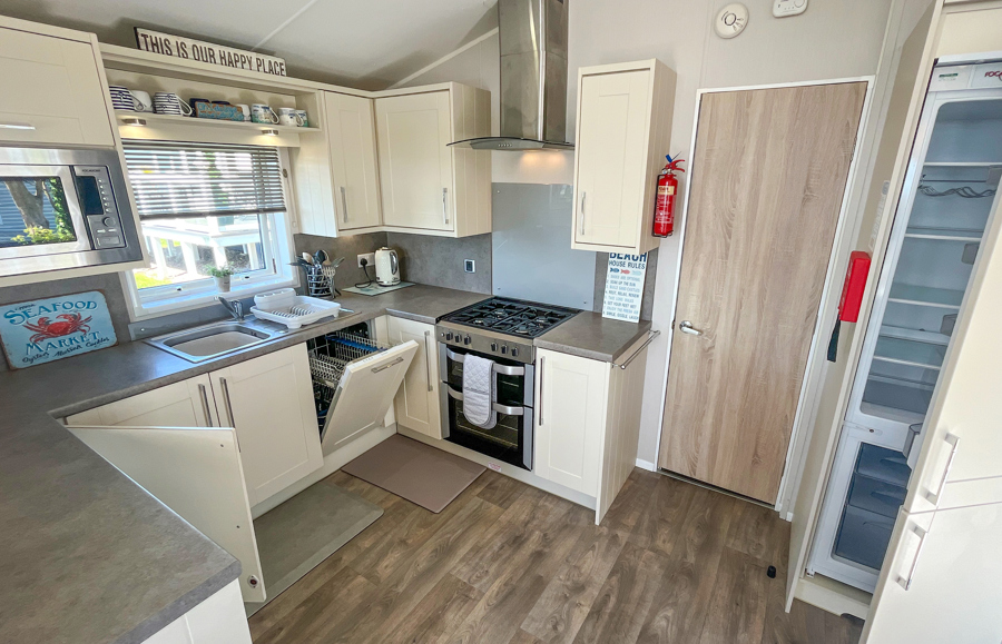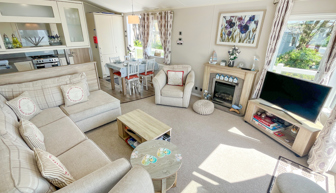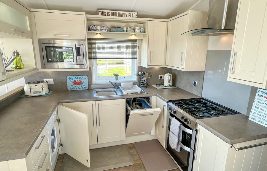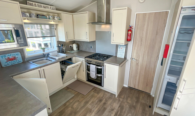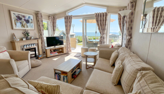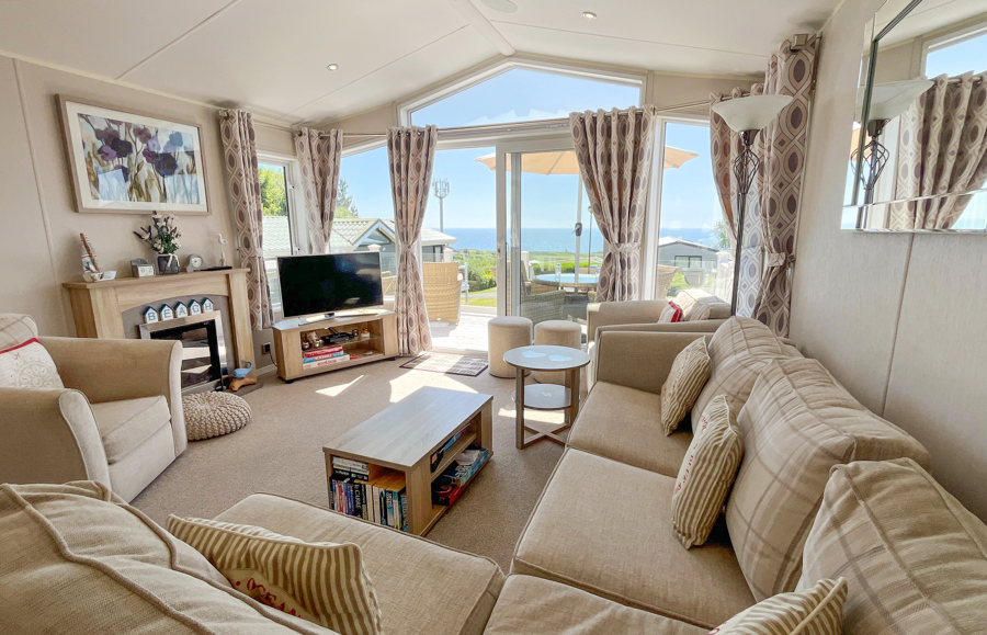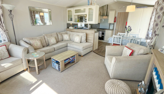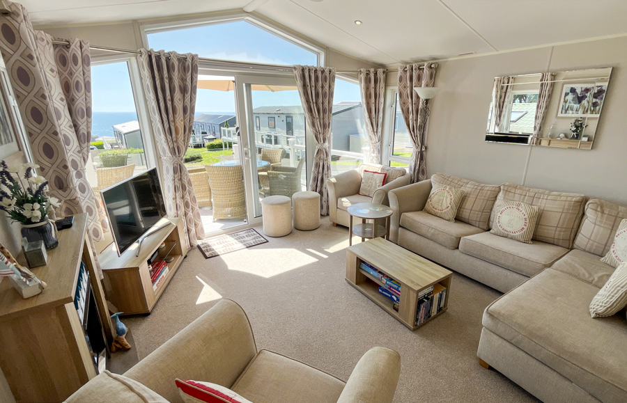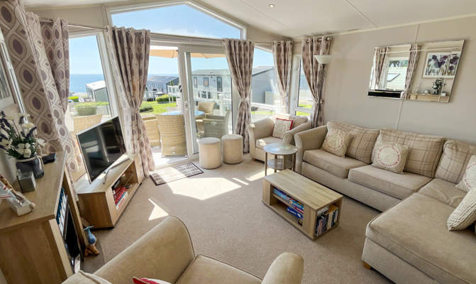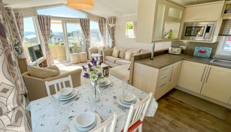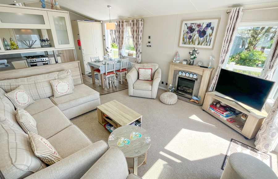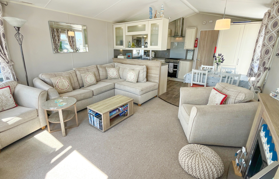 LOUNGE: TT8 benefits from sliding patio doors opening onto the veranda with sea views. This holiday home benefits from a comfortable lounge furnished with L-Shaped fixed seating and 2 arm chairs, colour TV, DVD, Free View and a modern flame effect fire. There is an occasional sofa bed available in the lounge.
