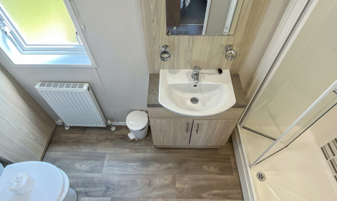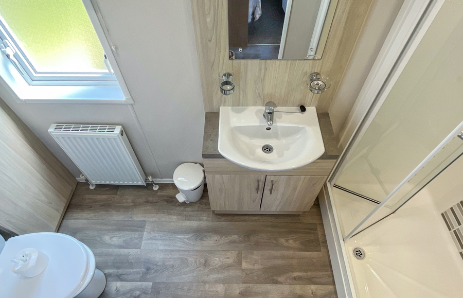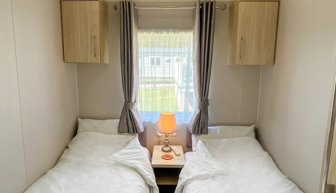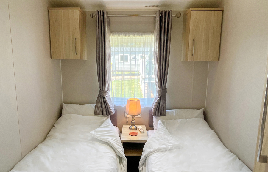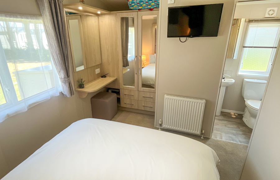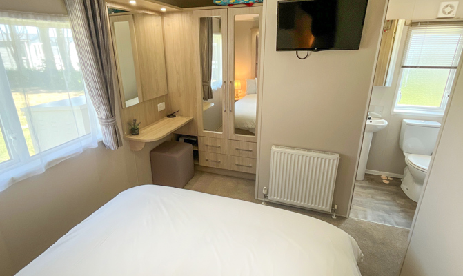 BEDROOMS: Three beautifully designed bedrooms, one good size master bedroom with vanity area, fitted wardrobes, wall mounted TV and en-suite shower room. Two twin rooms with small wardrobes and over bed storage. The twin beds can be pushed together to form additional doubles. TT8 can sleep 8 guests when using the sofa bed in the lounge.