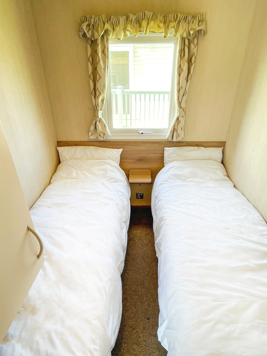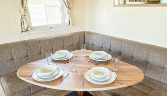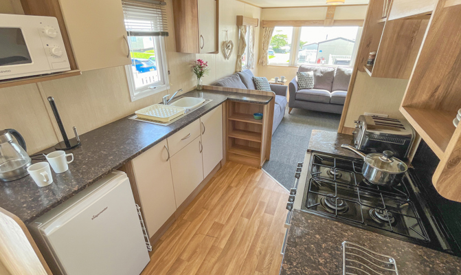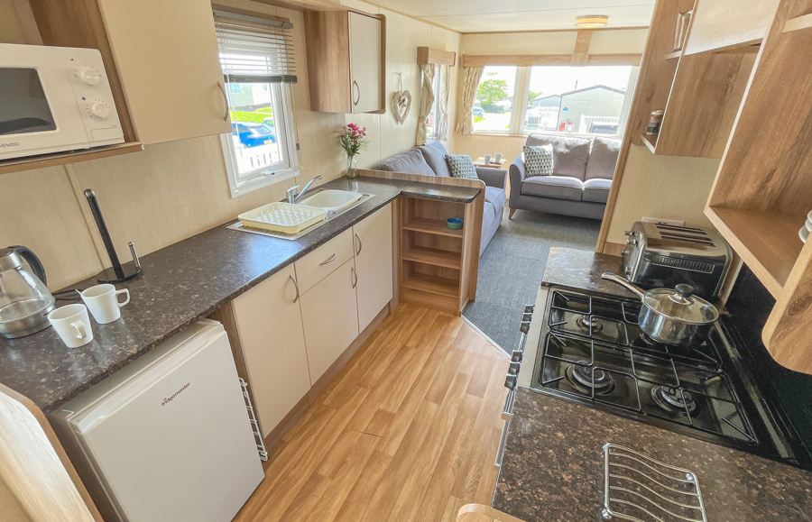 KITCHEN & DINING AREA: fully equipped kitchen which includes gas cooker, under counter FRIDGE (NO FREEZER BOX AVAILABLE) , microwave and utensils to cater for the family on your holiday. The dining area is comfortable with fixed corner seating plus stools.