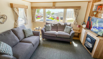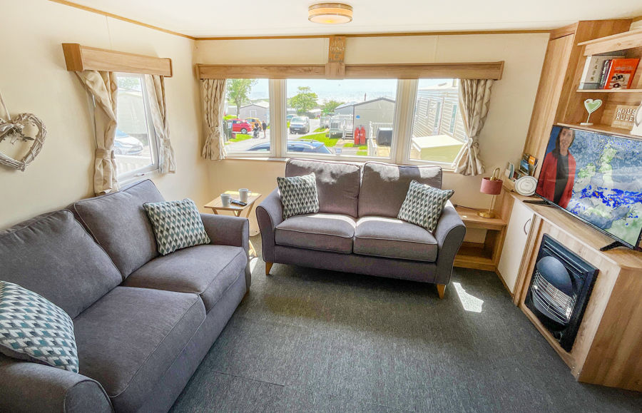 LOUNGE: The modern lounge is fitted with plenty comfortable fixed L-shape seating for all the family and has a Flat screen TV, DVD and Free view player, manufacturers gas fire. An occasional pull-out bed is available for those extra guests.