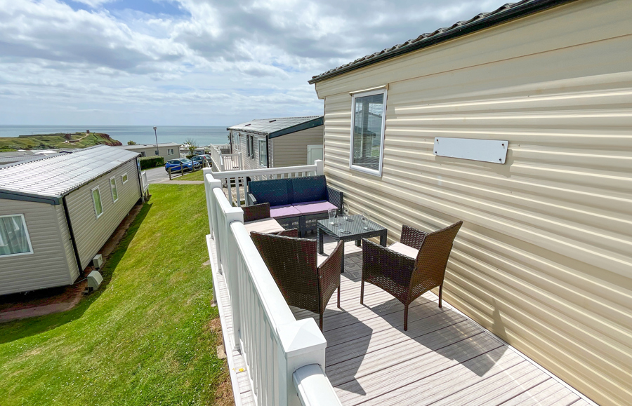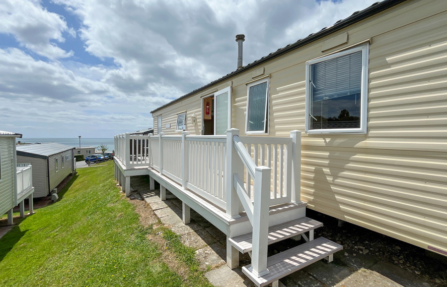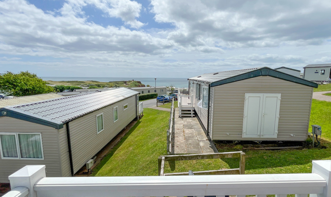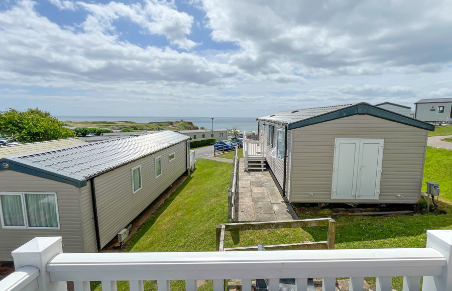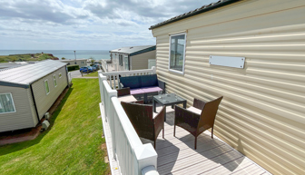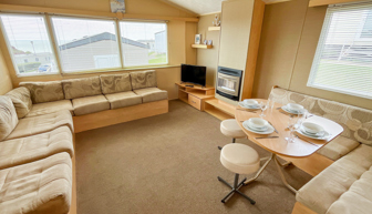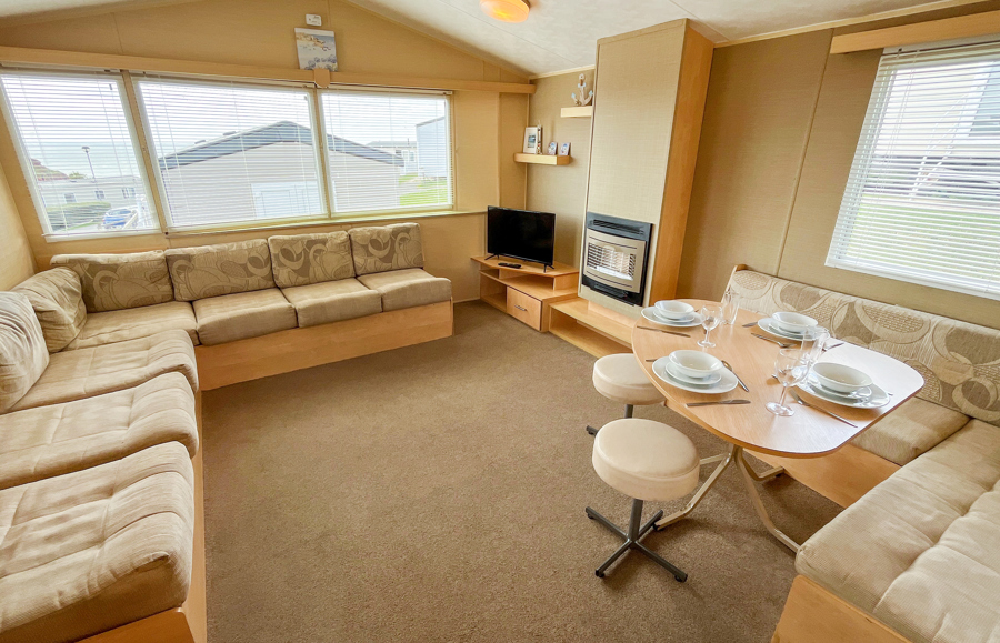 LOUNGE: Open plan lounge with fixed seating, sea views and gas fire. Flat screen TV with Freeview and DVD player. A pull-out bed is available.