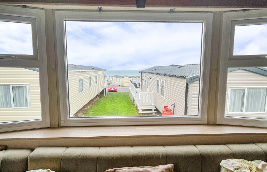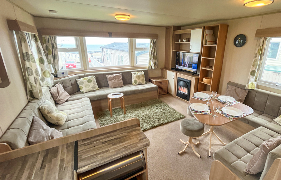 LOUNGE: The lounge benefits from a partial Sea View, with an open plan design, fixed corner sofa seating to cater for all the family, built in cabinets with TV, DVD and gas fire.