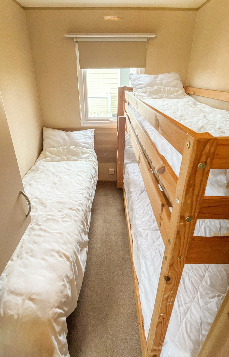 BEDROOMS: This accommodation has three bedrooms; the master consists of one double, a mirror and a fitted wardrobe. Twin room one consists of 2 single beds, a bedside cabinet, built-in wardrobe and mirror. Twin room 2 has bunk beds and a built-in wardrobe.