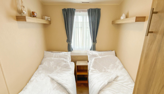 The twin room includes 2 single beds, small wardrobe and bedside cabinet.