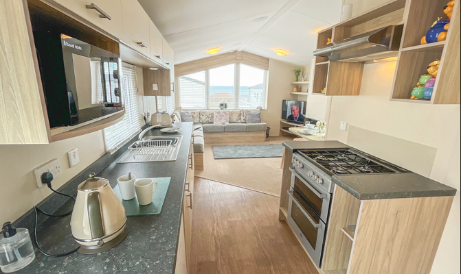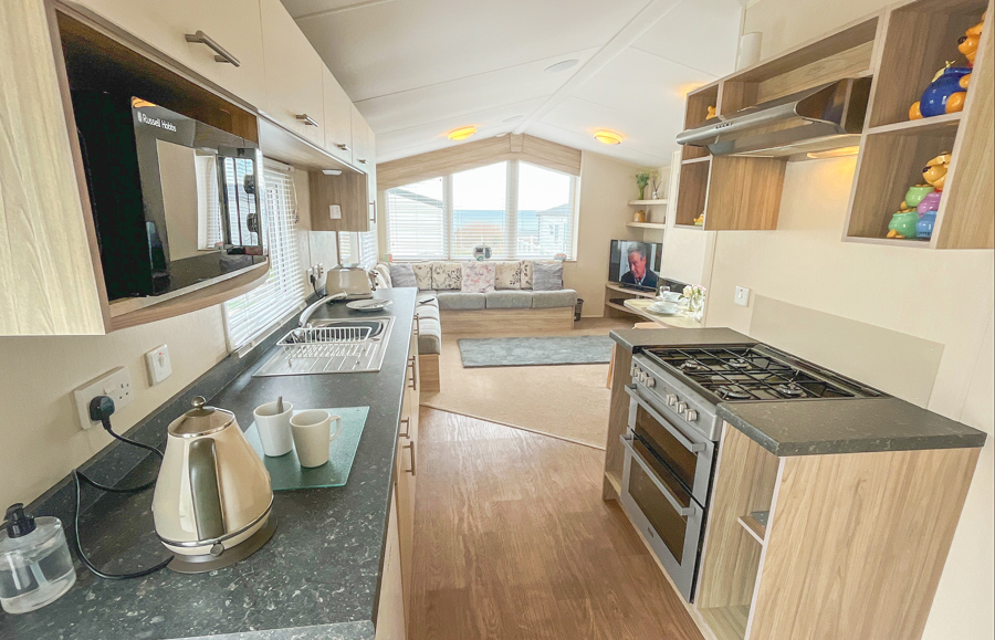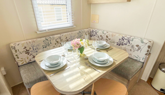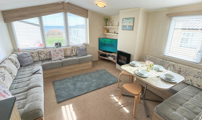 LOUNGE: The modern and spacious lounge is fitted with plenty of comfortable fixed corner seating for all the family (including an occasional pull-out bed) and has a Flat screen TV, DVD and electric fire.