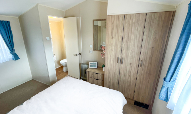 BEDROOMS: The master bedroom includes a double bed, bedside tables and fitted wardrobe, room for travel cot, en-suite w/c & fan heating.