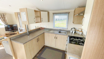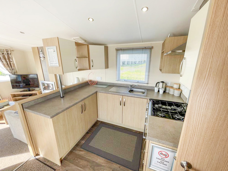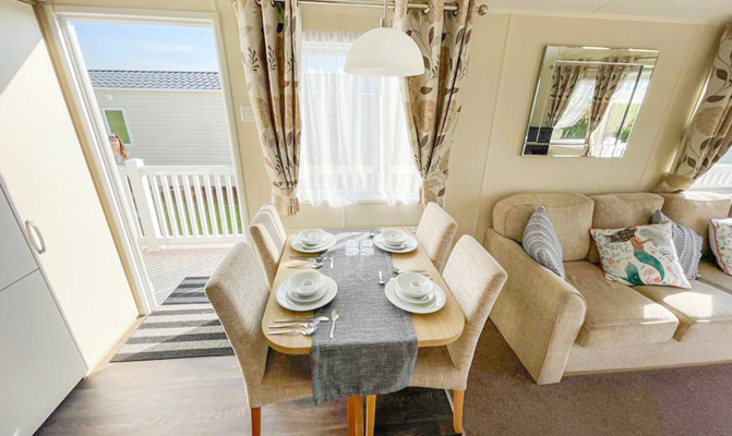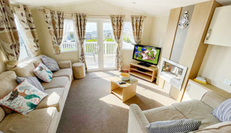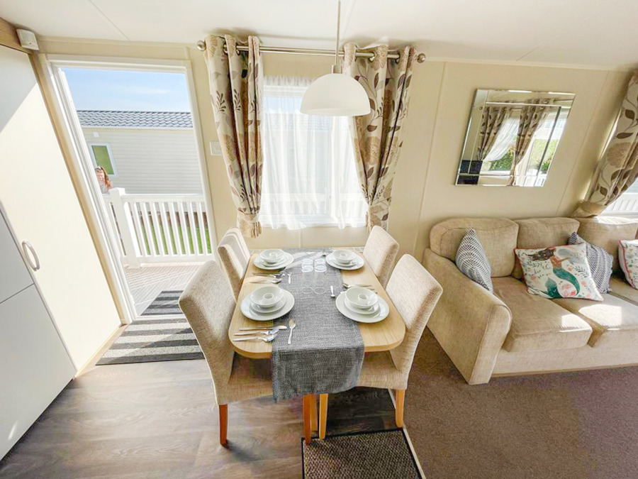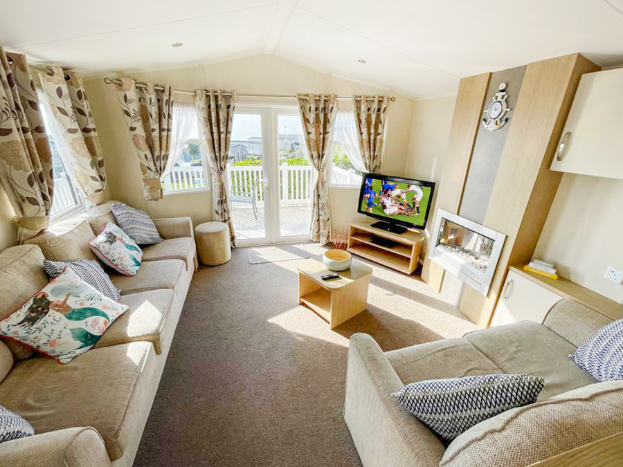 LOUNGE: This holiday home benefits from flat screen TV, DVD, Free view, coffee table and contemporary gas fire. An occasional pull-out bed is fitted in the sofa to accommodate a total of 8 guests.