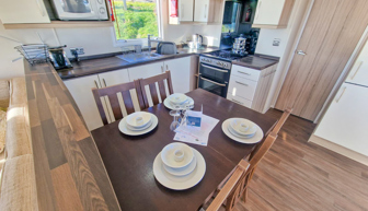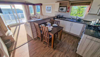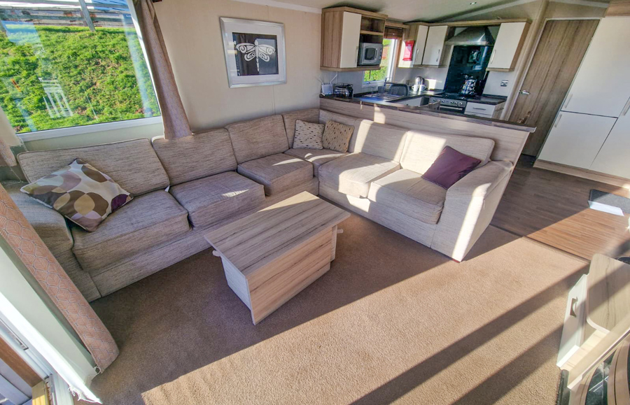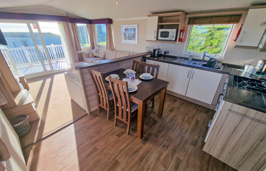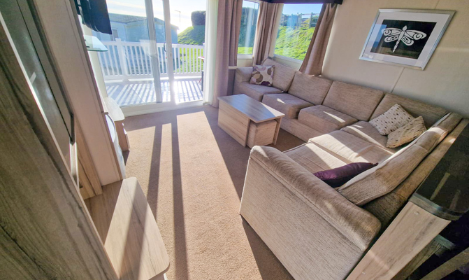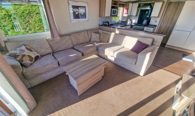 LOUNGE: This holiday home benefits from an open plan lounge with generous seating. Prepare to sit back and relax as the lounge is complete with flat screen TV & free view, there is also patio doors leading to the veranda. DG16 can accommodate 8 guests.