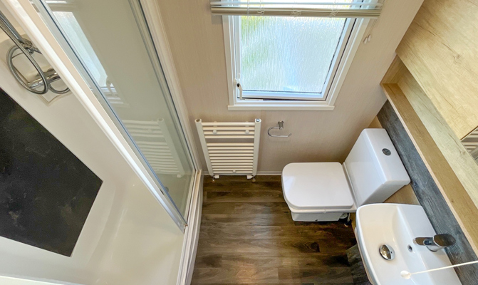 SHOWER ROOM: Shower cubicle, toilet, hand basin and radiator.