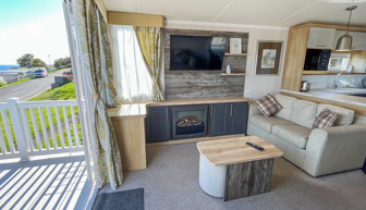 LOUNGE: Open plan with two and 3-seater sofas. Flat screen wall mounted TV with Freeview. Integrated Bluetooth speakers, USB sockets, coffee table with cubed stools, electric flame fireplace and radiator.