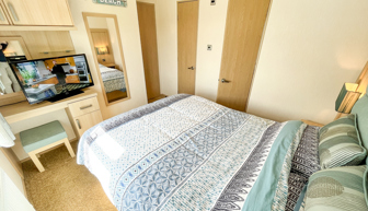 BEDROOMS: Two bedrooms, one spacious double fitted with wardrobe and vanity area and Tv. The main room also benefits from a shower, toilet and wash basin en-suite. The twin room is of a good size with single beds and fitted wardrobe. The maximum number of guests that EP14 can cater for is 6.