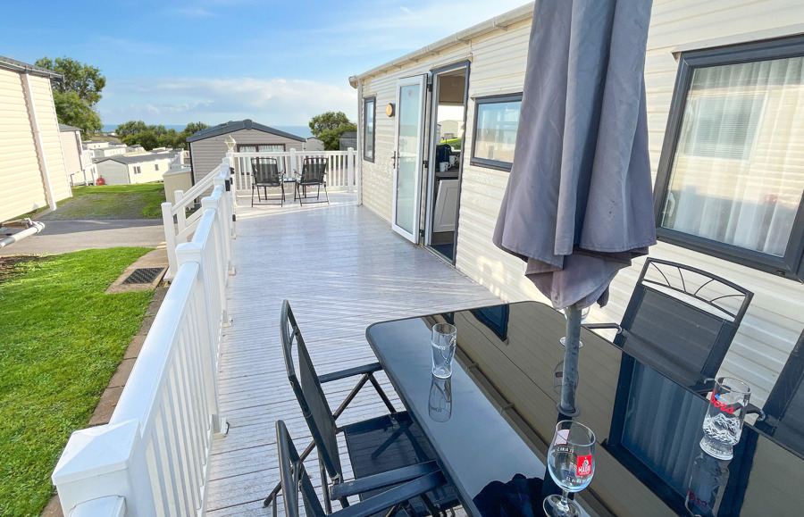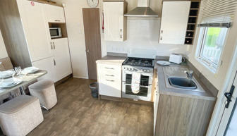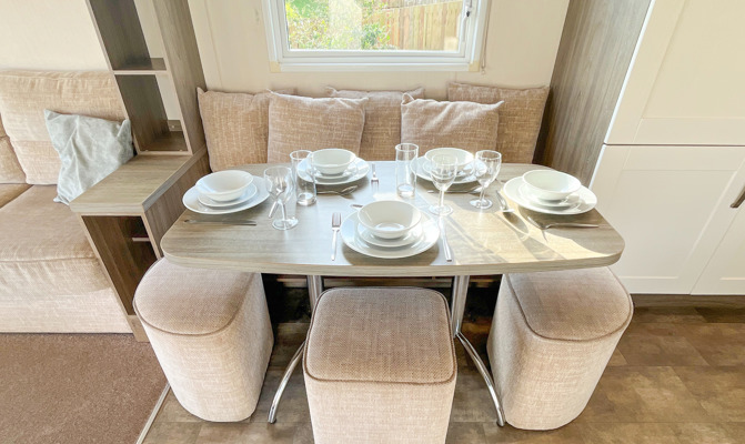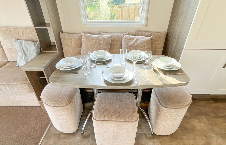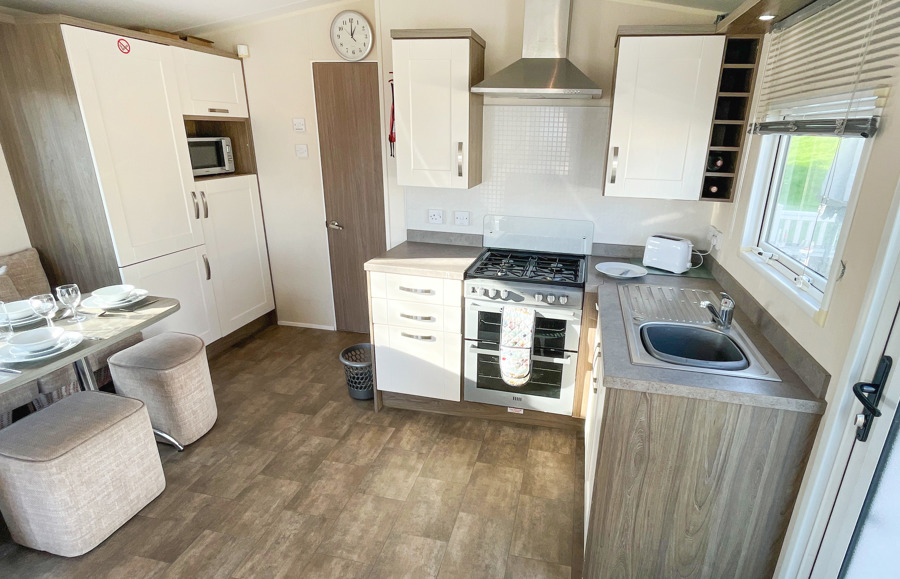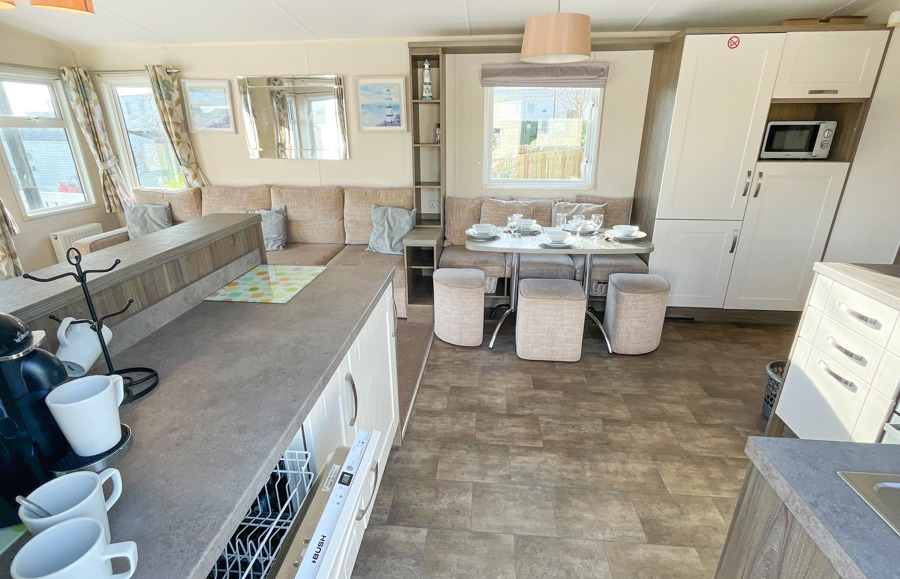 KITCHEN & DINING AREA: Modern kitchen which includes a full-size integrated 60/40 fridge-freezer, microwave, cooker & dishwasher. The dining area comes complete with fitted table, fitted bench seating and 3 stool.