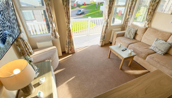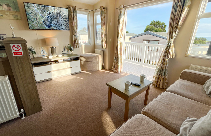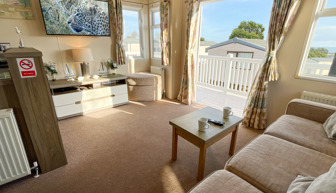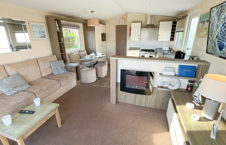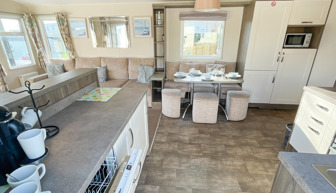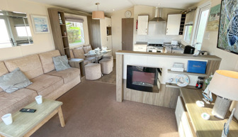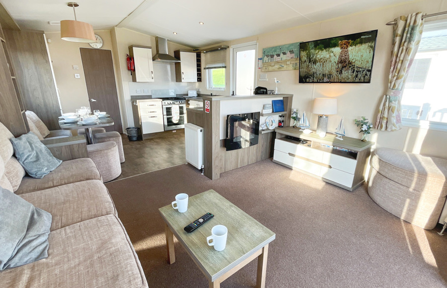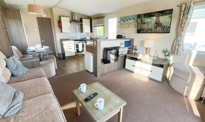 LOUNGE: This holiday home benefits from a comfortable lounge furnished with L-Shaped fixed seating and 2 armchairs, 42" TV, Free View and an electric fire.