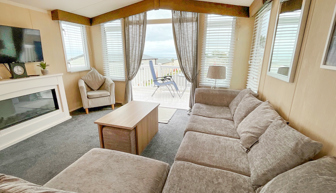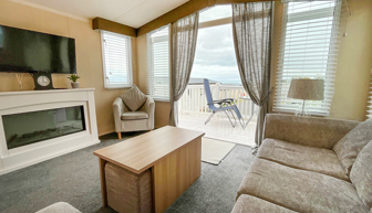 LOUNGE: Open plan with corner sofa and separate arm chair. French doors open out on to the veranda, wall mounted Flat screen TV with Freeview. Coffee table with cubed stools and electric flame effect fireplace.
