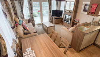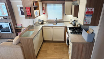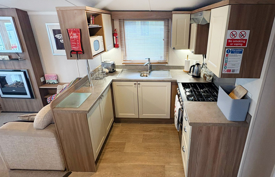 KITCHEN & DINING AREA: The caravan is fitted with full size single oven and grill, microwave, fridge freezer and the necessary utensils. The dining area comprises of a freestanding table and 4 chairs.