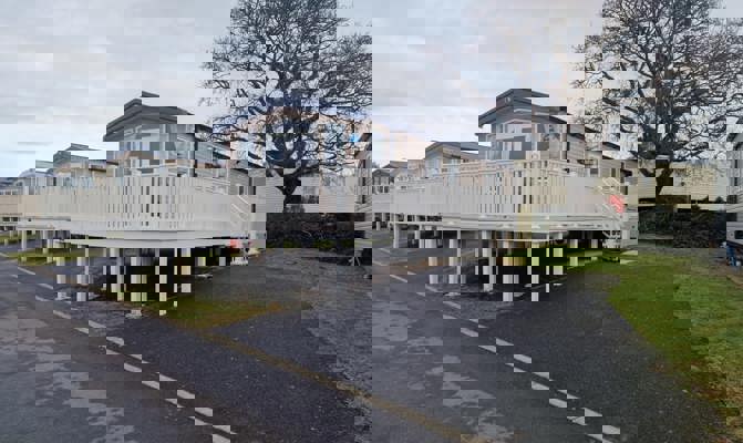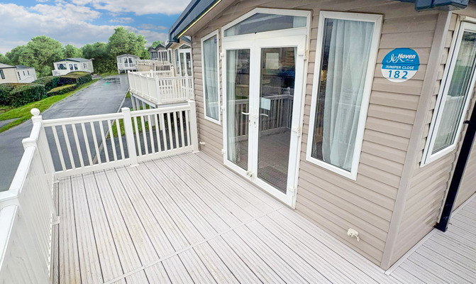 Key features: French doors, veranda, dog friendly, double glazing, central heating, en-suite toilet and fridge freezer, room for a travel cot, dining area, family shower room.