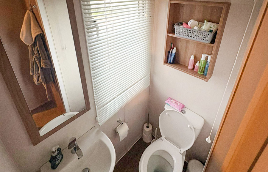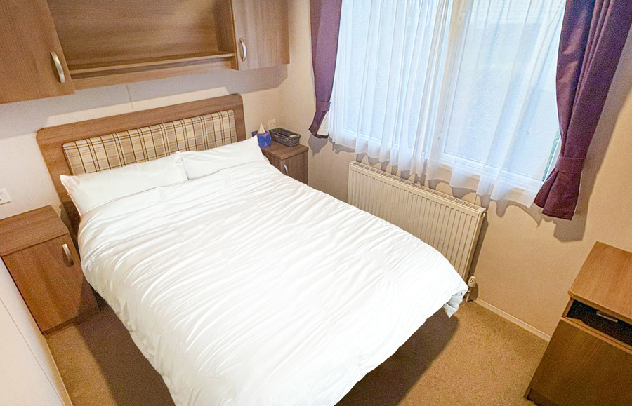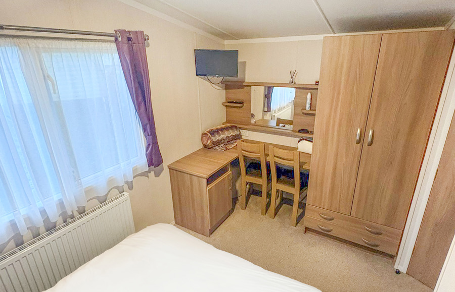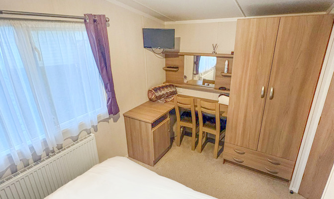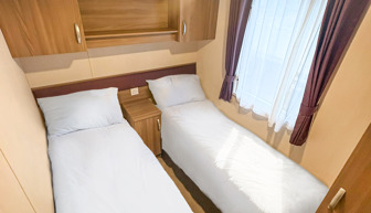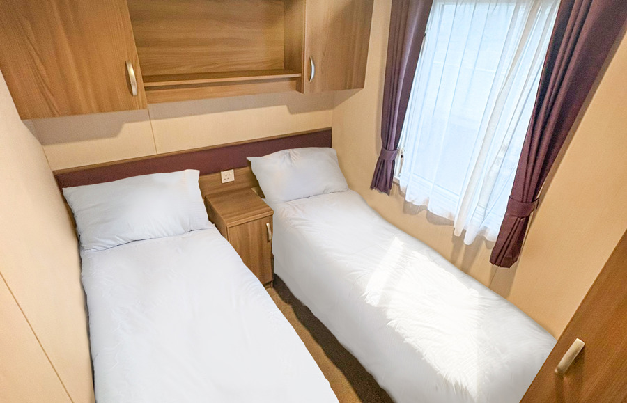 The twin rooms both have two single beds, each have a small fitted wardrobe with radiator, overhead storage and bedside tables. As mentioned before there is an occasional pull out bed fitted in the lounge.