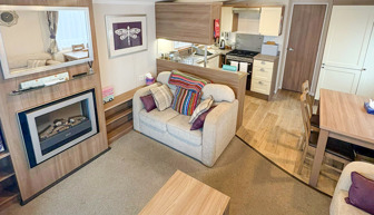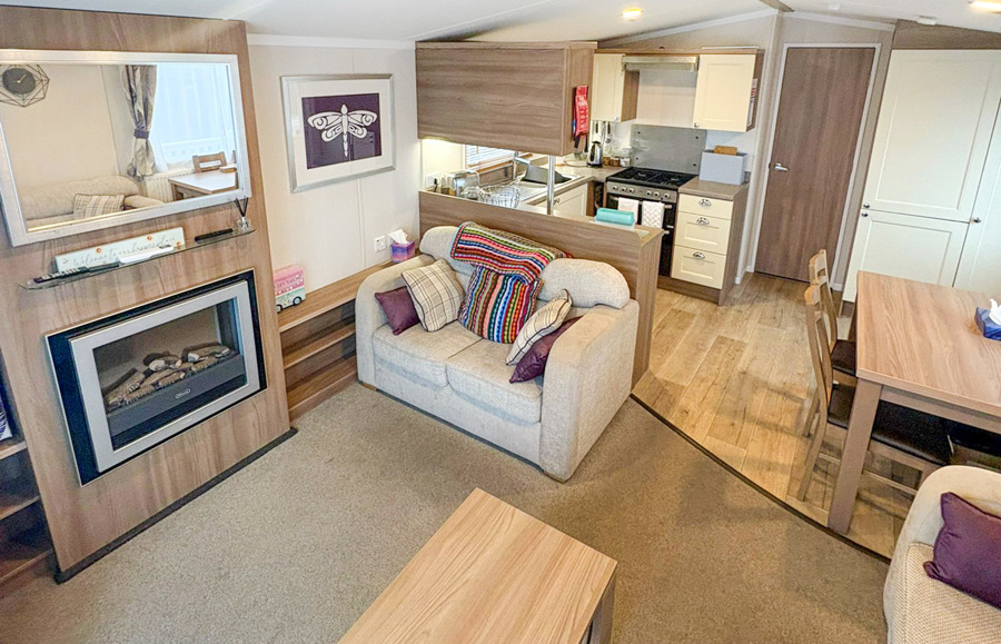 LOUNGE: The lounge is a modern style with comfortable 2 & 3 seater sofas that also has an occasional pull out bed for additional guests. Fixed wall cabinet with flat screen TV and integrated DVD player and fitted electric fire.