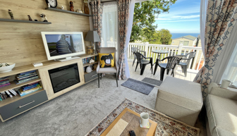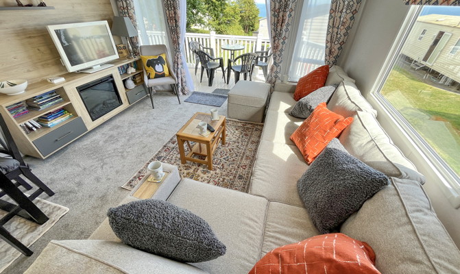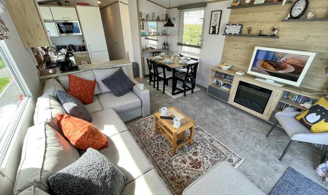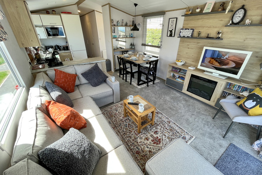 LOUNGE: The lounge is a modern and open plan style with comfortable fixed seating that also has an occasional pull out bed for additional guests. Fixed wall cabinet with flat screen TV and integrated DVD player and fitted electric fire.