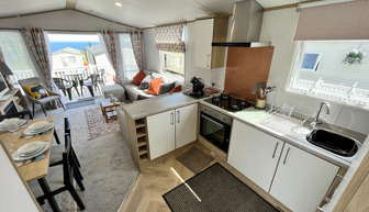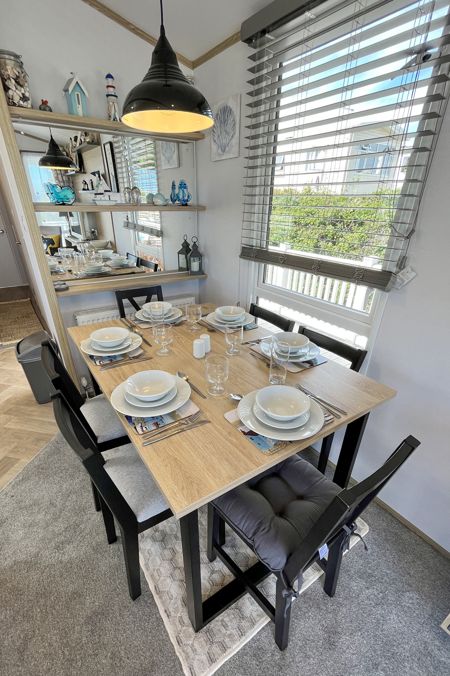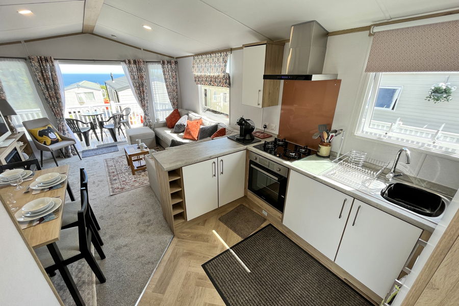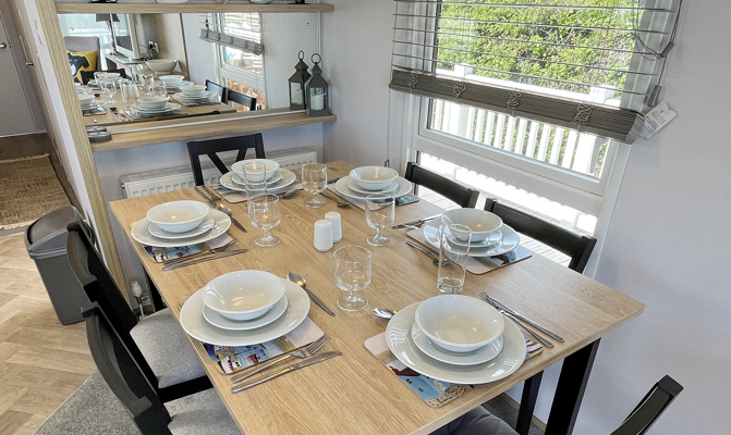 KITCHEN & DINING AREA: The caravan is fitted with full size single oven and grill, microwave, fridge freezer and the necessary utensils. The dining area comprises of a fixed seated area with free standing table and stools.