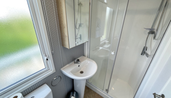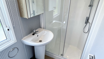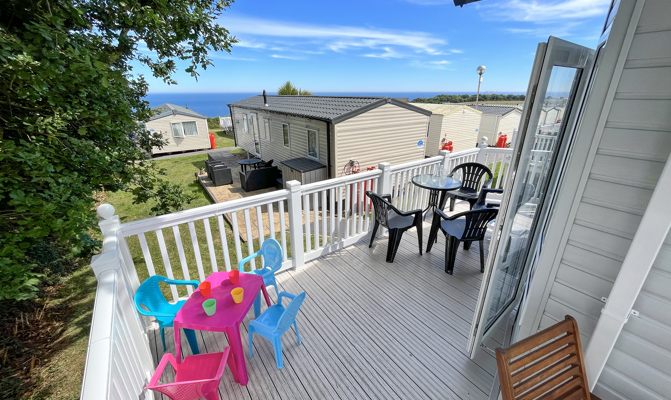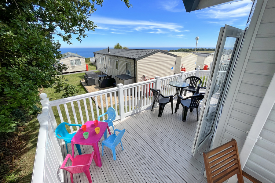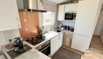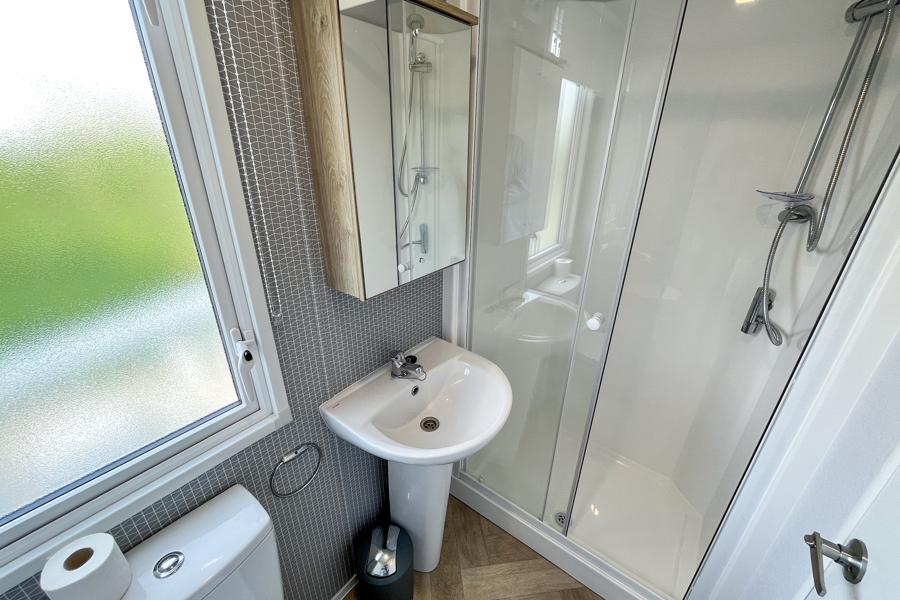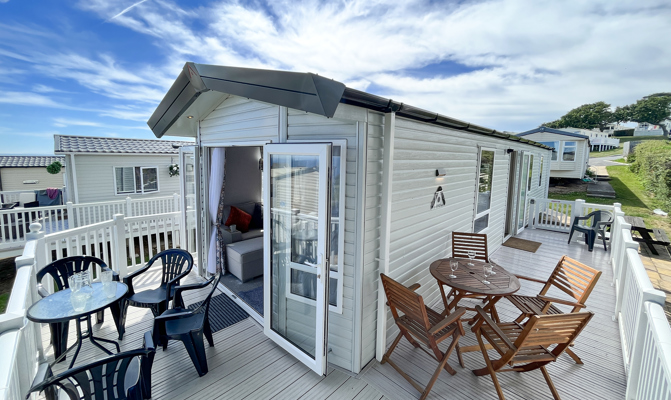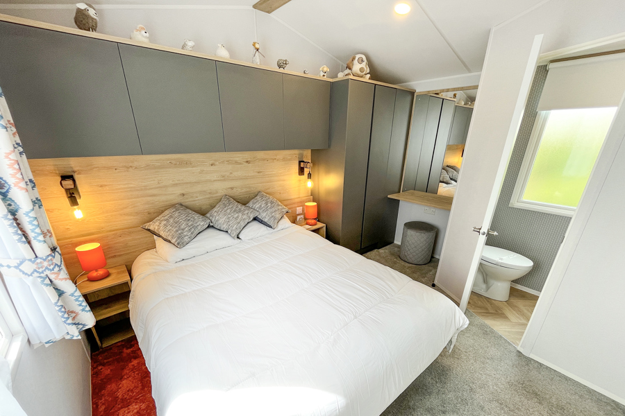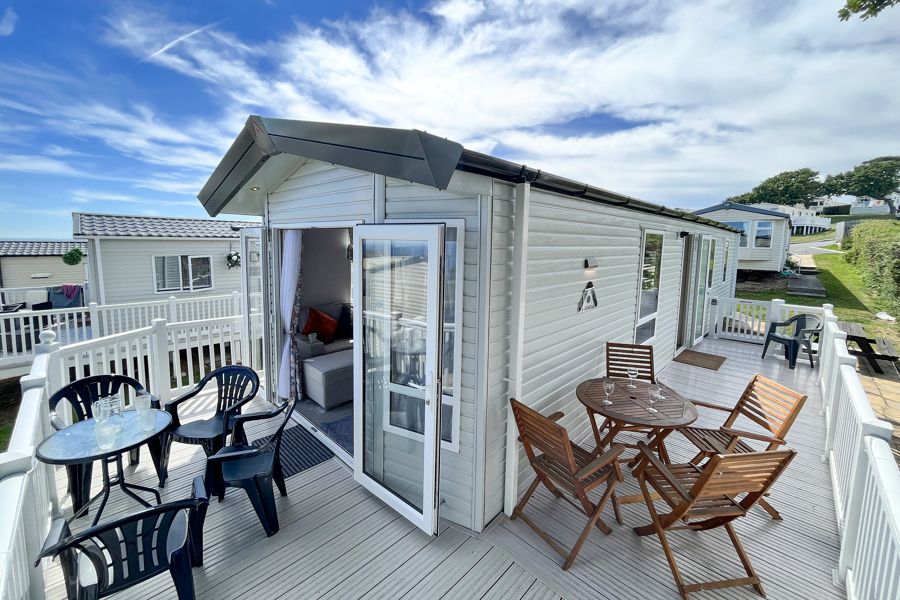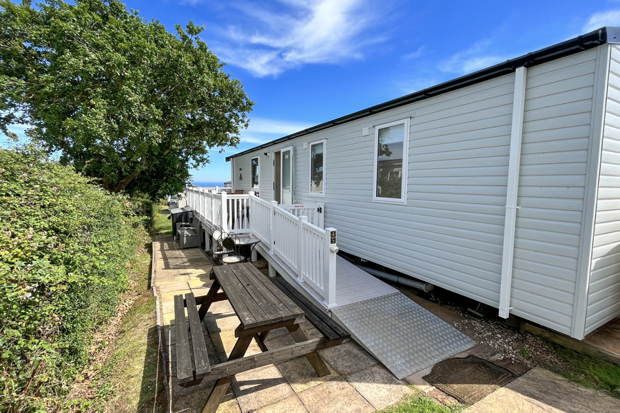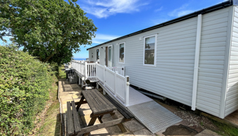 Key features: French doors, ramped veranda, dog friendly, double glazing, central heating, en-suite toilet and room for a travel cot in master bedroom, fridge freezer, dining area, family shower room.